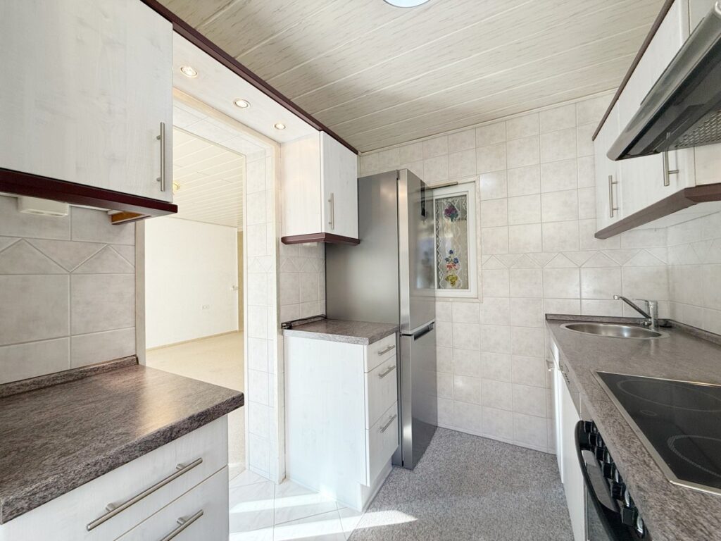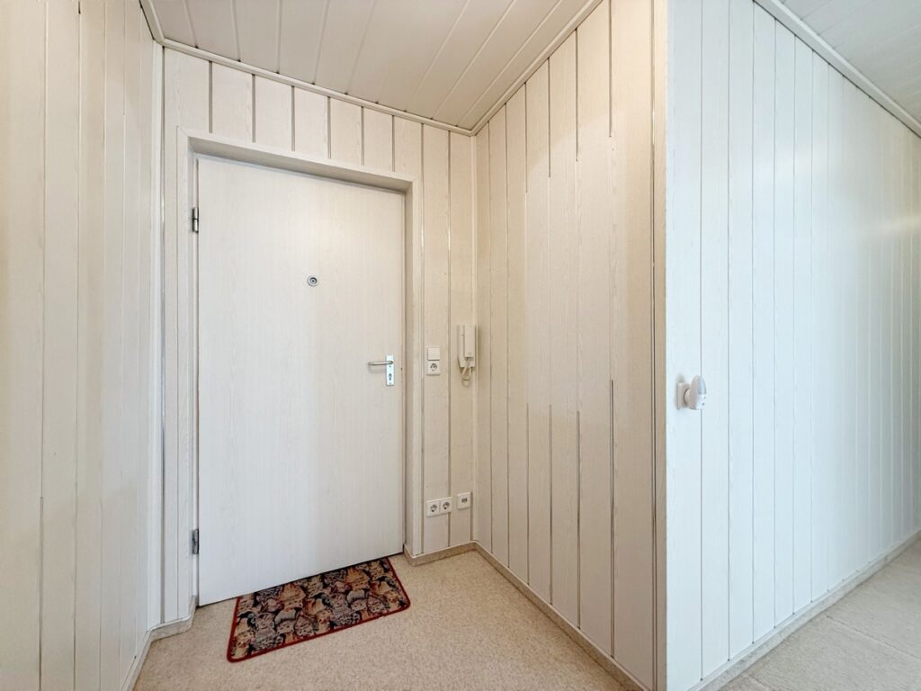 In der gesamten Wohnung finden sich weiße Holzvertäfelungen an den Decken, die eine warme und einladende Atmosphäre schaffen und die Böden sind mit Teppich ausgelegt.