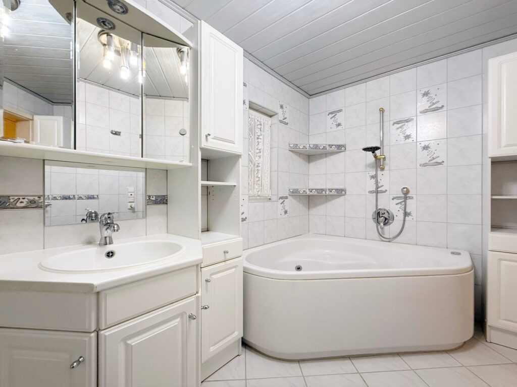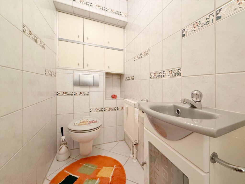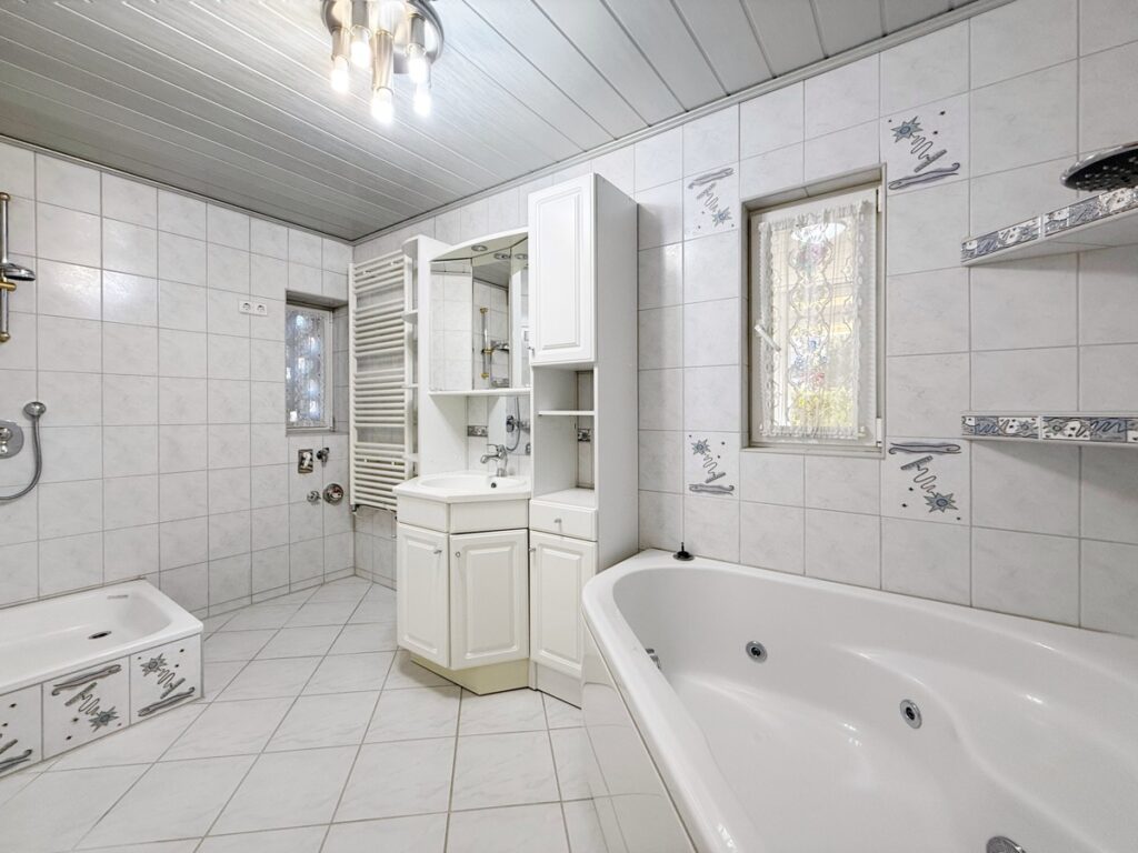Über den Flur erreichen Sie das innenliegende Badezimmer, das vollständig gefliest ist und mit einer Eckbadewanne, einer Dusche, einem Handtuchheizkörper sowie einem Waschtisch ausgestattet ist. Ein separates WC befindet sich nebenan.