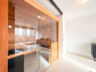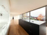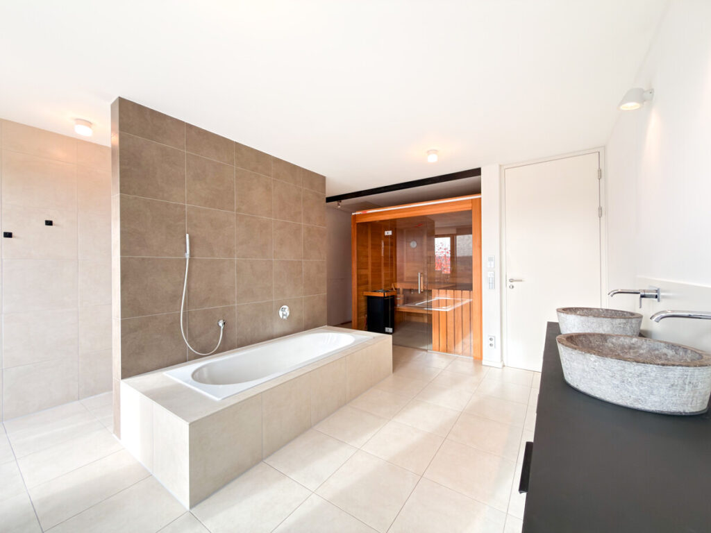 Eine praktische Schmutzschleuse verbindet die Garage direkt mit dem Haus – trockenen Fußes gelangen Sie von einem Bereich in den anderen. Über das moderne Treppenhaus, das durch eine große Glasscheibe vom Wohnbereich abgetrennt ist, führt eine elegante Betontreppe ins Obergeschoss. Hier erwarten Sie: ein großes Kinderzimmer, ein Schlafzimmer mit offener Ankleide, ein luxuriöses Masterbad mit Badewanne, bodengleicher Dusche, Doppelwaschtisch und eigener Sauna. Alle drei Räume haben direkten Zugang zum Balkon und bieten eine wunderschöne Aussicht. Auch hier unterstreichen deckenhohe Aluminiumfenster den exklusiven architektonischen Stil.