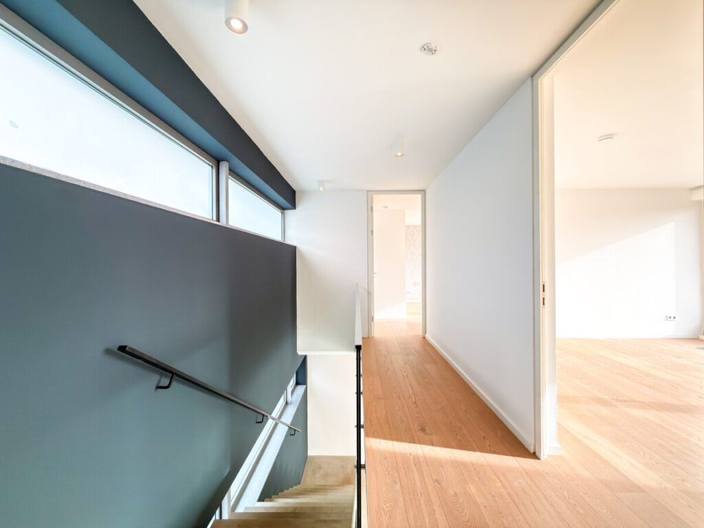Im unteren Bereich sorgt ein edler Eichedielen-Parkettboden für Wärme und Wertigkeit, während die hochwertige Einbauküche mit großem Küchenblock zum Mittelpunkt des Alltags wird. Die Zwischenebene, die zugleich den großzügigen Eingangsbereich bildet, umfasst: ein Gäste- oder Kinderzimmer, ein Bad en Suite mit Dusche, Waschtisch und WC, ein elegantes Gäste-WC und viel Platz für eine großzügige Garderobe.