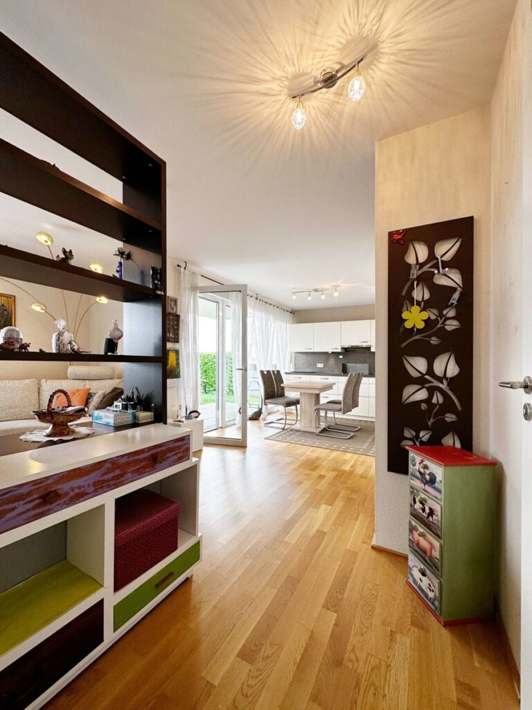 Die hier angebotene 3 Zimmer Wohnung befindet sich in einem Mehrfamilienhaus und besticht durch ihre moderne und barrierefreie Ausstattung. Beim Betreten der Wohnung öffnet sich ein helles und neuwertiges Wohnkonzept. Der großzügige und offene Wohnbereich verfügt über einen integrierbaren Essbereich und eine moderne Schreiner-Einbauküche, die bereits im Kaufpreis enthalten ist. Die bodentiefen Fenster sorgen für eine angenehme Helligkeit und bieten Zugang zur Terrasse mit einem kleinen Gartenanteil. Direkt beim Eingang befindet sich das großzügige und hellgeflieste Gäste-WC. Über den Flur gelangt man zu den weiteren Räumlichkeiten, wie dem Kinderzimmer und dem großzügigen Schlafzimmer. Auch hier sorgen bodentiefe Fenster für viel Licht und bieten Zugang zur Terrasse. Das moderne Badezimmer ist mit einer bodenebenen und großzügigen Dusche, einem Waschbecken und einem WC ausgestattet. Die Badezimmerfliesen sind in einem hellen Ton gehalten, während der Boden in einem ansprechenden Grau gehalten ist.