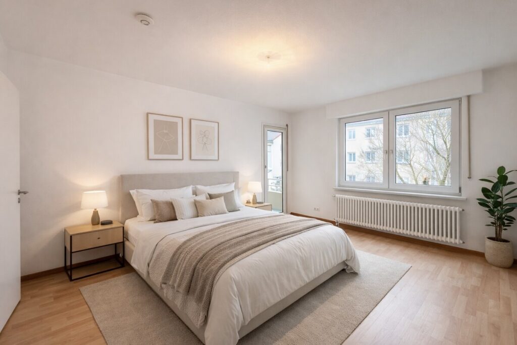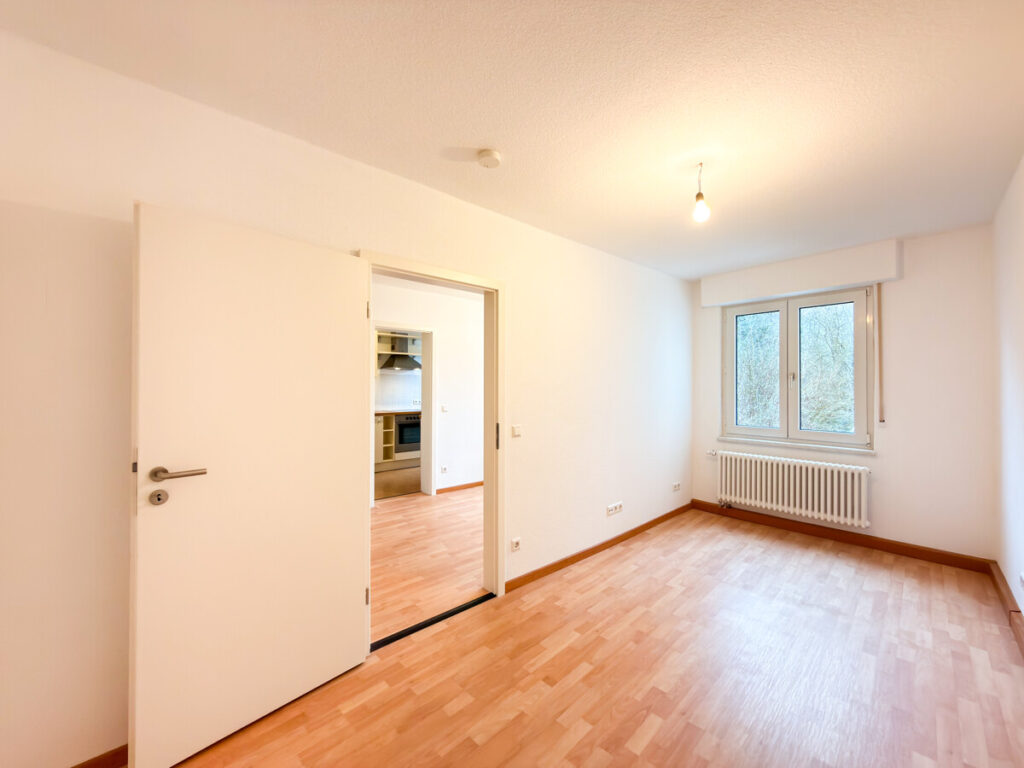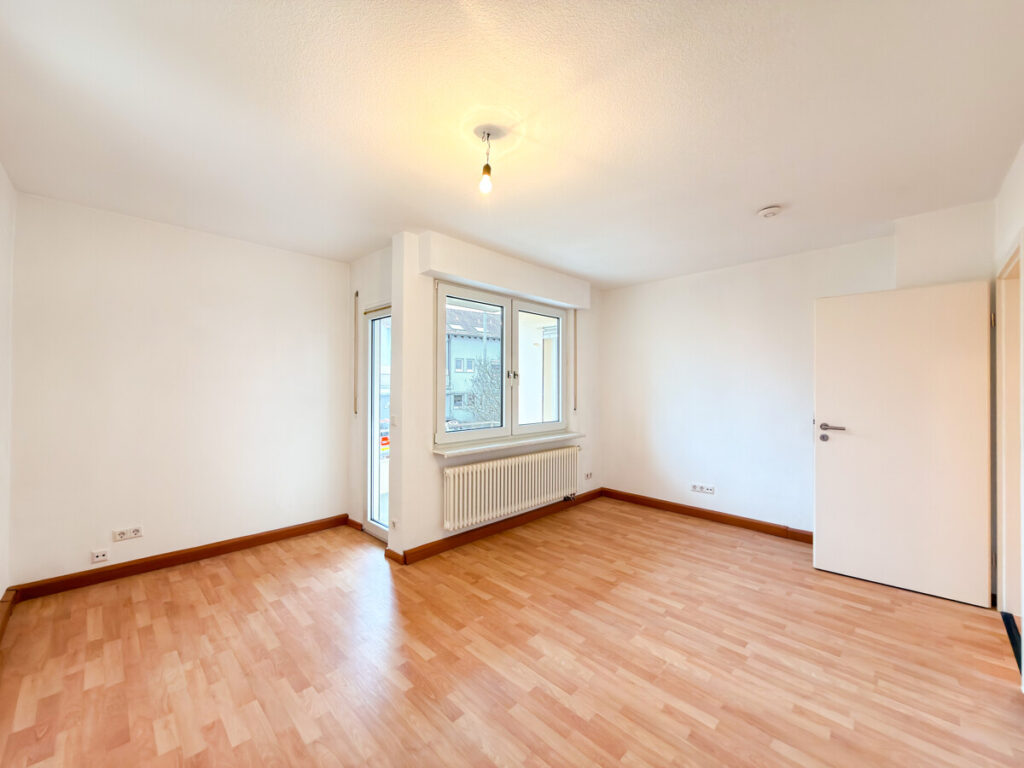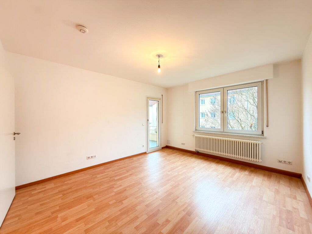 Gegenüber liegt das Schlafzimmer, das individuell eingerichtet werden kann und direkten Zugang zum Balkon bietet – ideal für einen entspannten Start in den Tag. Auch das großzügige Wohnzimmer ist lichtdurchflutet und eröffnet ebenfalls den Zugang zum Balkon. Hier entsteht ein harmonischer Wohnbereich mit viel Platz für individuelle Gestaltung.
