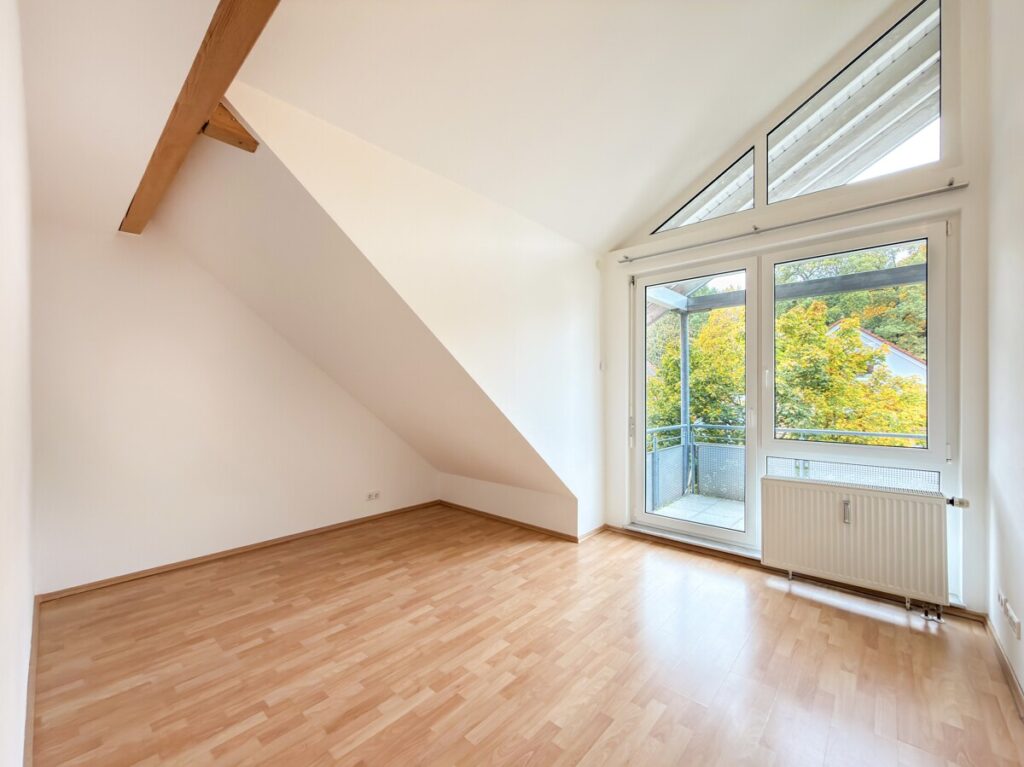 Auf dieser Wohnebene stehen Ihnen insgesamt drei weitere Zimmer zur Verfügung, die flexibel als Schlaf-, Kinder- oder Arbeitszimmer genutzt werden können. Eines dieser Zimmer verfügt ebenfalls über einen Zugang zum Balkon. Die Kombination aus Dachschrägen und hohen Decken verleiht allen Räumen eine behagliche und zugleich besondere Wohnatmosphäre.