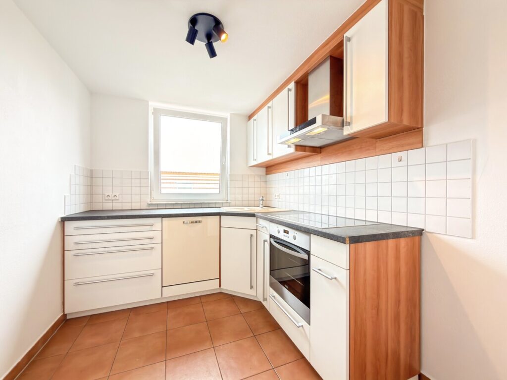 Gegenüber liegt die separate Küche, ausgestattet mit einer modernen Einbauküche, die genügend Stauraum und Arbeitsfläche bietet.