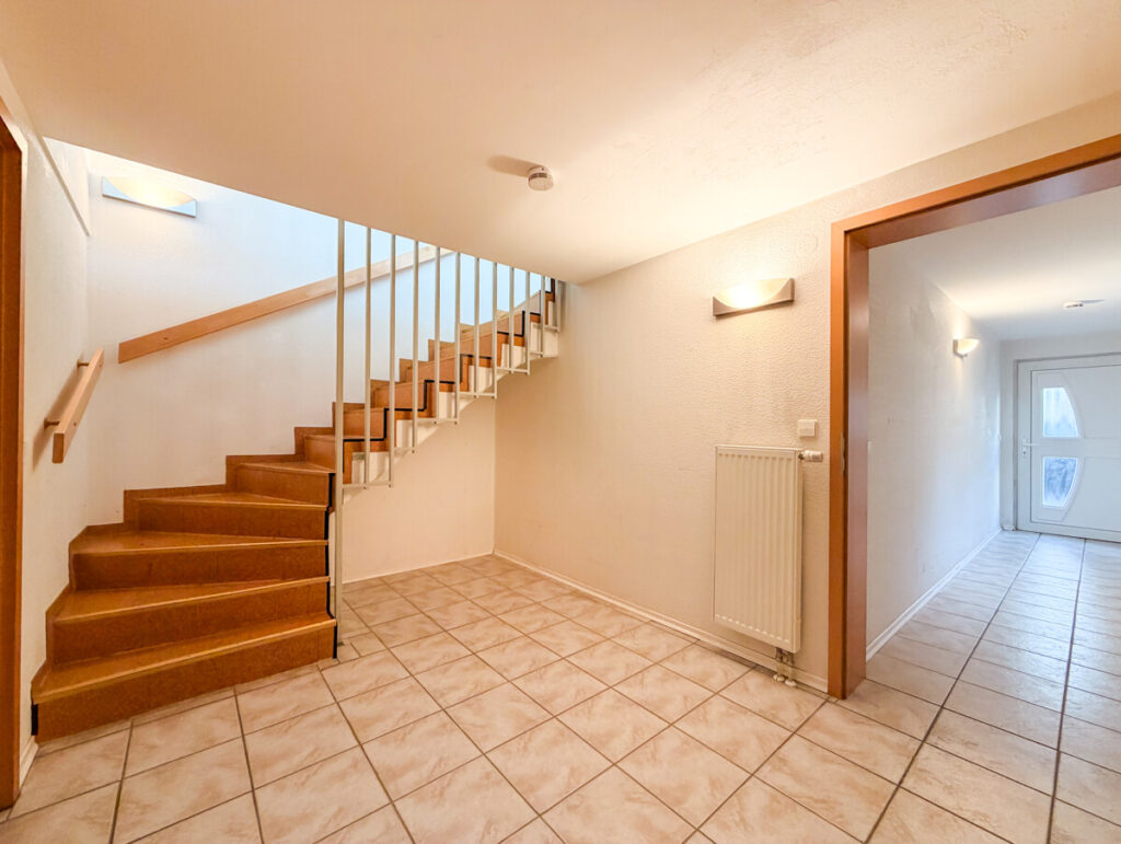 Bereits der Eingangsbereich neben der Garage bietet einen praktischen Zugang ins Haus. Im Untergeschoss befindet sich der Eingangsbereich mit Platz für Ihre Garderobe, ein Kellerraum mit Waschmaschinenanschluss und der Treppenaufgang in den großzügigen Wohn- und Essbereich. Große Fensterflächen sorgen hier für viel Tageslicht und einen schönen Blick in den Garten. Von hier aus gelangen Sie direkt auf die sonnige Terrasse mit Markise – perfekt für entspannte Stunden im Freien. Der zugehörige Garten steht zur Alleinbenutzung zur Verfügung.