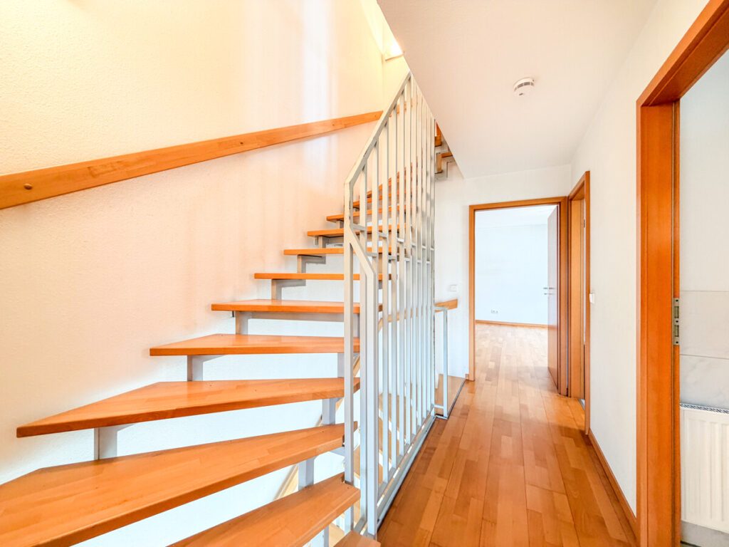 Im Obergeschoss erwarten Sie zwei gut geschnittene Schlafzimmer – ideal als Eltern- und Kinderzimmer – sowie ein helles Tageslichtbad. Das WC befindet sich separat nebenan. Auf dieser Etage ist hochwertiges Echtholzparkett verlegt, das für eine warme Wohnatmosphäre sorgt.