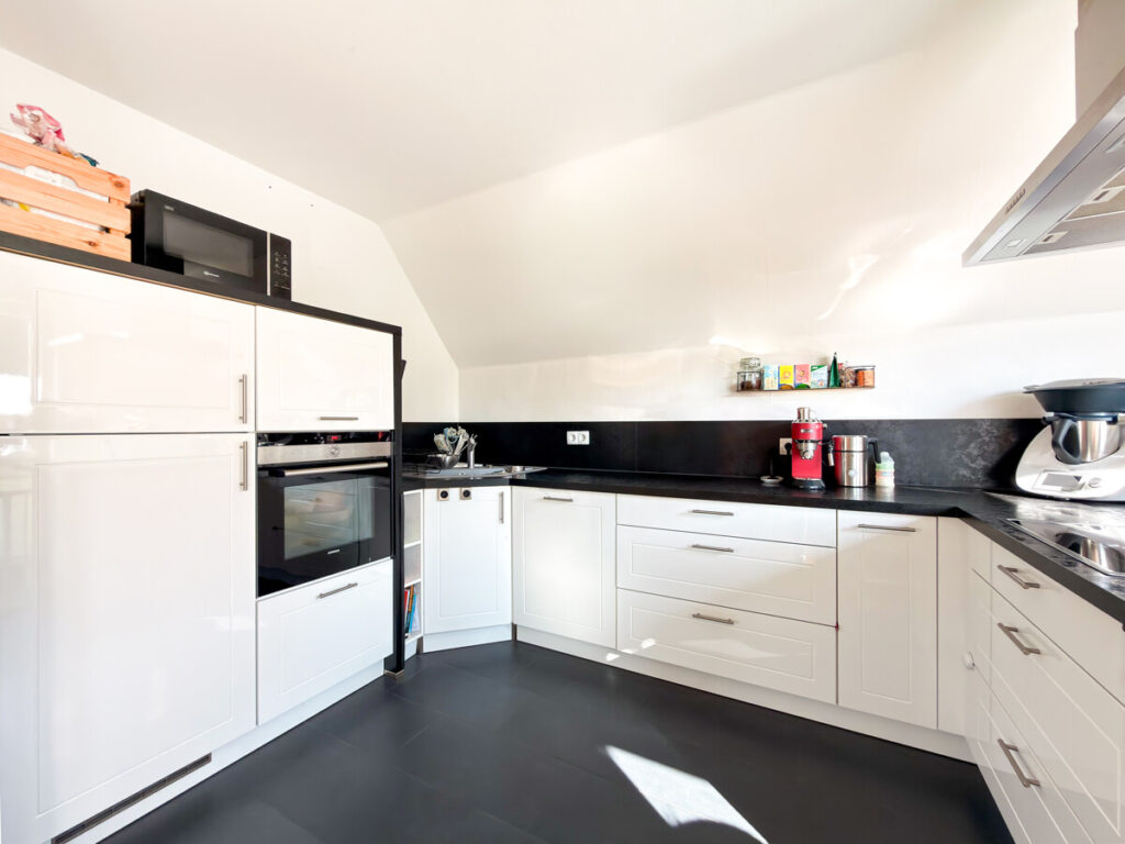 Die moderne, offen integrierte Küche präsentiert sich in zeitlosem Weiß und fügt sich harmonisch in den Wohnbereich ein. Von hier aus gelangen Sie auf den überdachten Balkon, der zu entspannten Stunden im Freien einlädt.