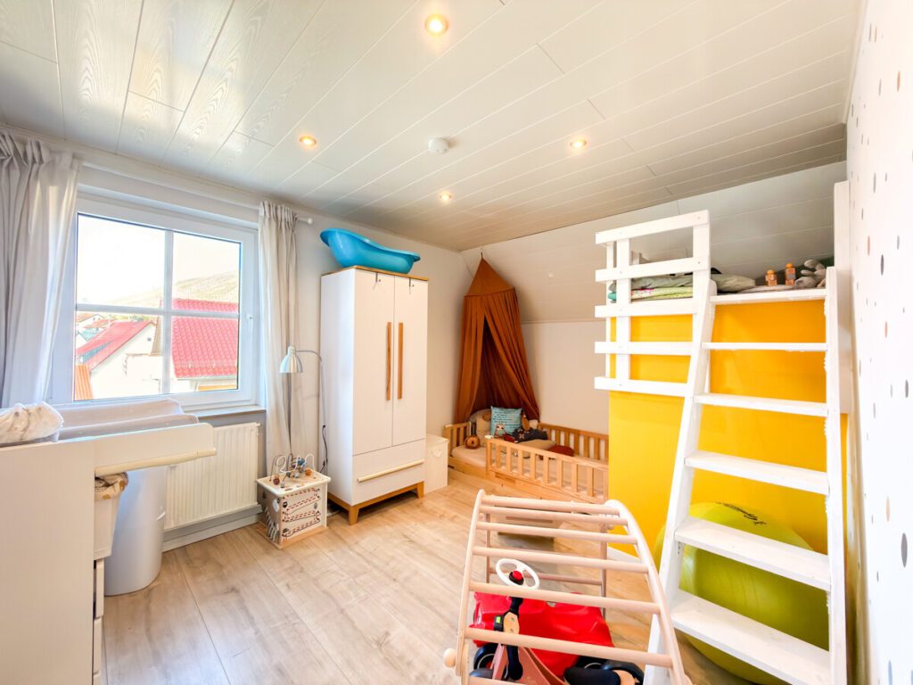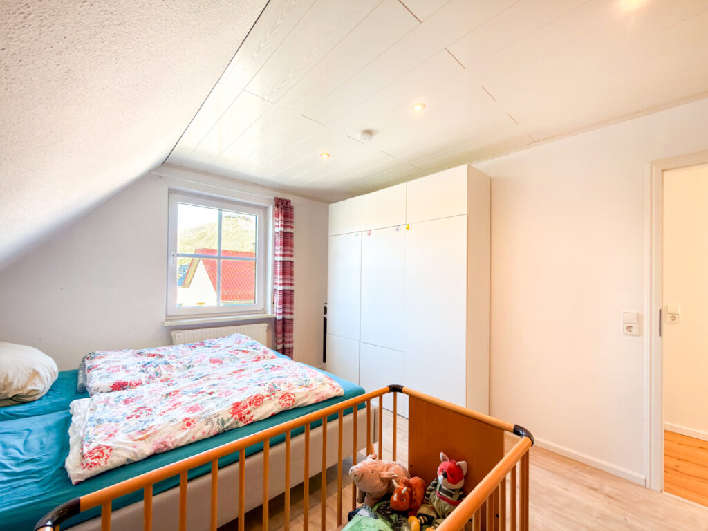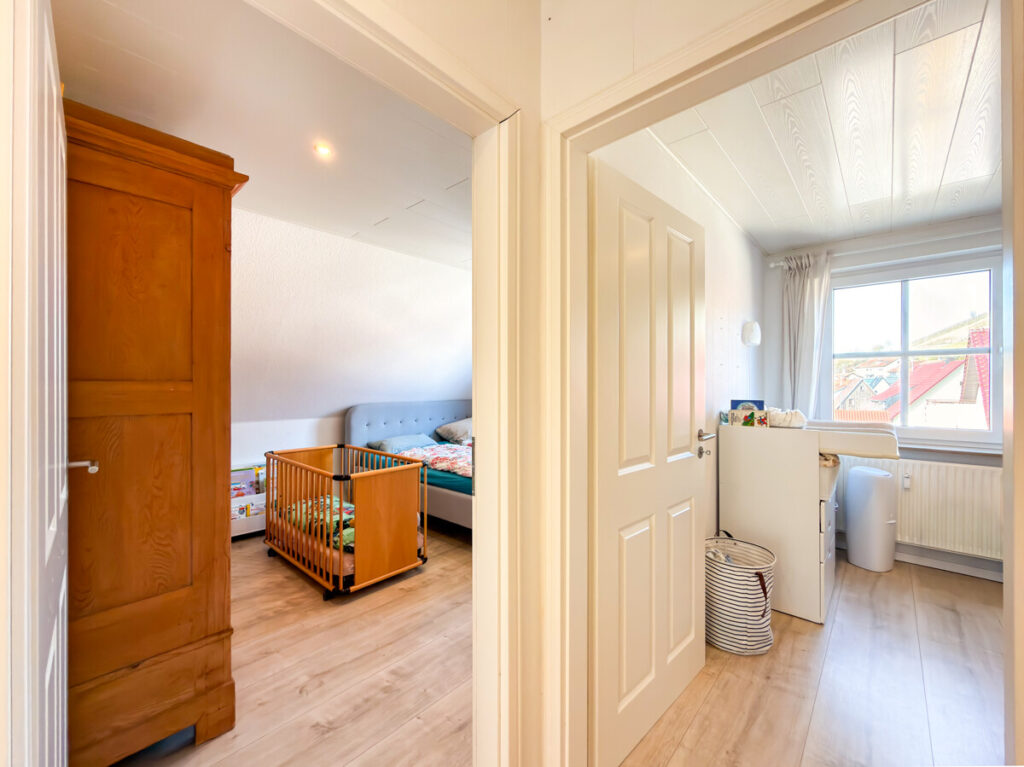 Auf dieser Ebene befinden sich zudem das Schlafzimmer sowie ein weiteres Zimmer, das sich ideal als Kinderzimmer oder Büro eignet. Beide Räume bieten flexible Gestaltungsmöglichkeiten für unterschiedliche Wohnbedürfnisse. Ergänzt wird diese Etage durch ein innenliegendes Badezimmer mit Dusche und Waschbecken.