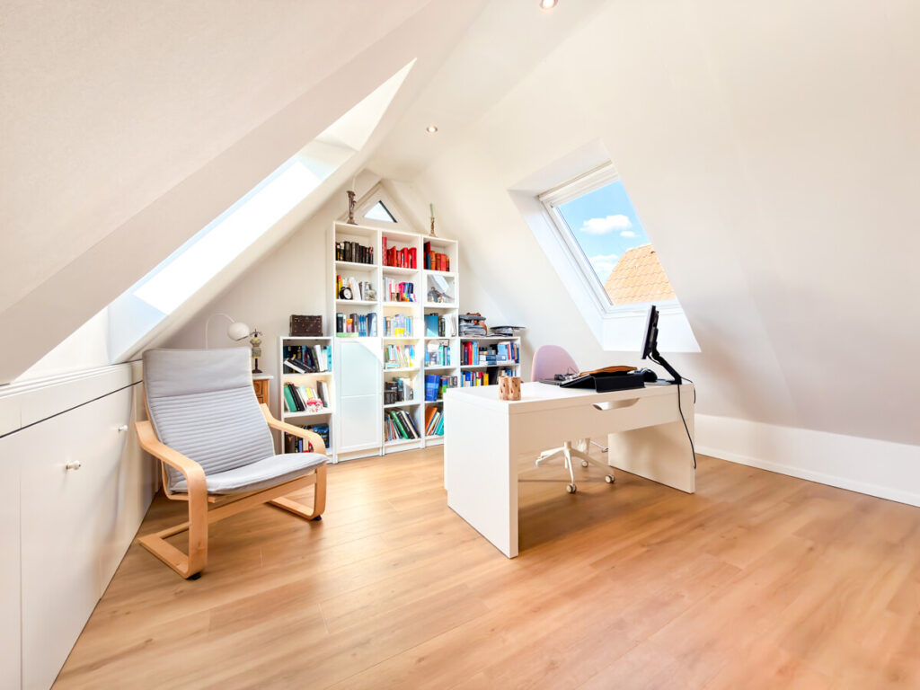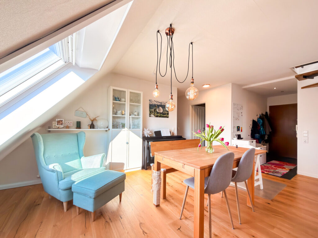 Über eine elegante Wendeltreppe im Wohnbereich gelangen Sie in die obere Ebene der Wohnung. Hier öffnet sich ein großzügiger Galeriebereich, der sich wunderbar als zusätzlicher Wohn-, Arbeits- oder Loungebereich gestalten lässt. Die charakteristischen Dachschrägen und die Fenster sorgen für eine angenehme, helle Atmosphäre mit viel Tageslicht.