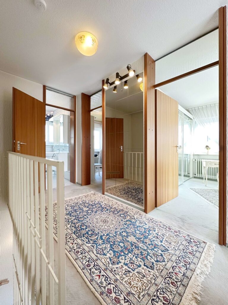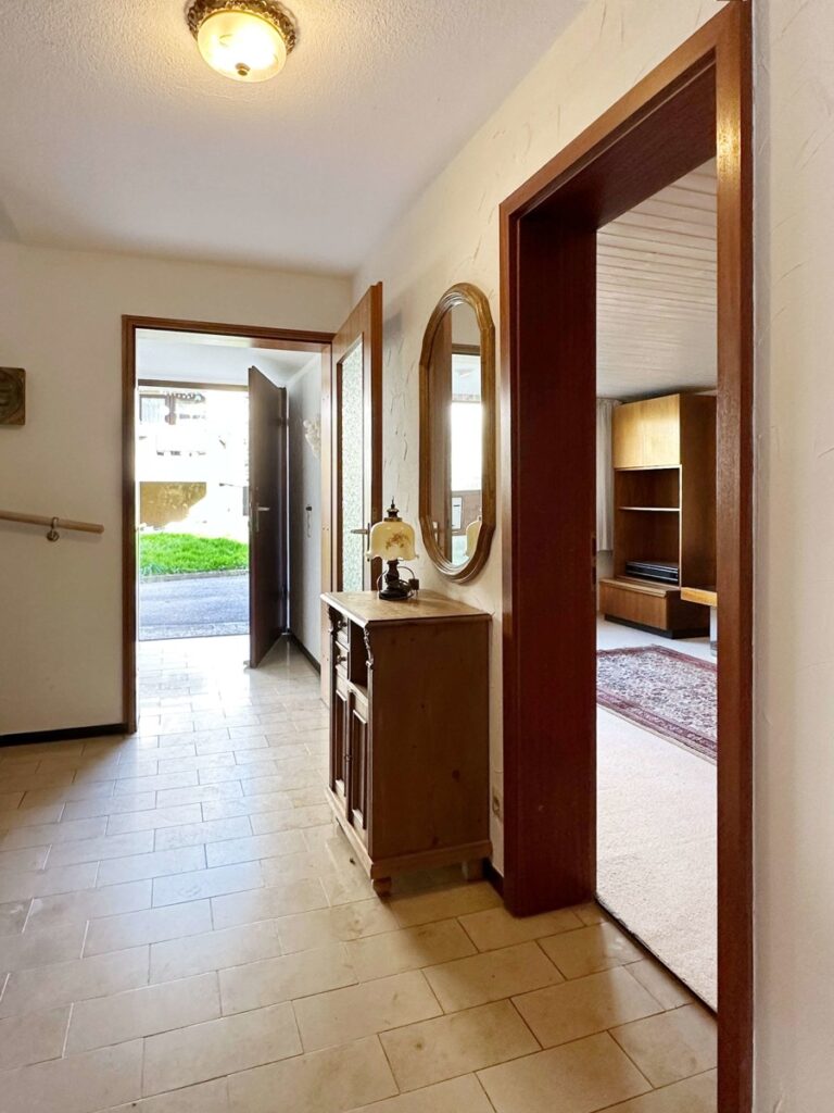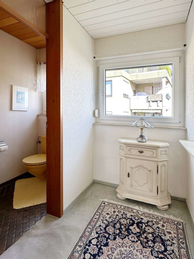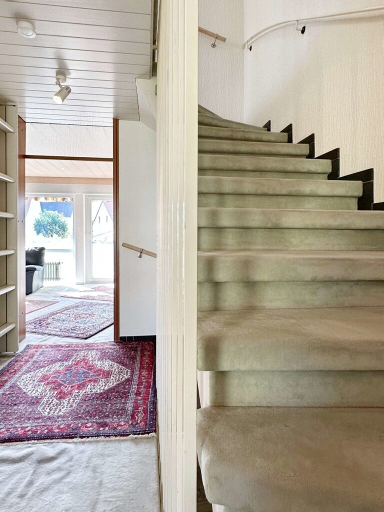 Beim Betreten des Hauses fällt der großzügige Windfang auf, der ausreichend Platz für eine Garderobe bietet. Im Erdgeschoss befindet sich der großzügige Hobbyraum der vielseitig genutzt werden kann, zum Beispiel als Gäste- oder Arbeitszimmer. Dieser Raum ist in der Wohnflächenberechnung nicht berücksichtigt. Auch die Kellerräume und ein Wirtschaftsraum sowie die Gaszentralheizung sind im Erdgeschoss untergebracht. Über eine Treppe im Flur erreicht man in das erste Obergeschoss, wo sich das große, offene Wohnzimmer mit Essbereich befindet. Von hier aus ist auch die Küche zugänglich, die ebenfalls über den hellen Flur erreicht werden kann. Der überdachte Balkon bietet einen angenehmen Platz zum Entspannen, während man über ein paar Stufen direkt in den sonnigen Garten mit Terrasse gelangen kann, um den Tag ausklingen zu lassen. Auf dieser Ebene befindet sich auch ein Gäste-WC, das noch aus dem Ursprungsjahr stammt.