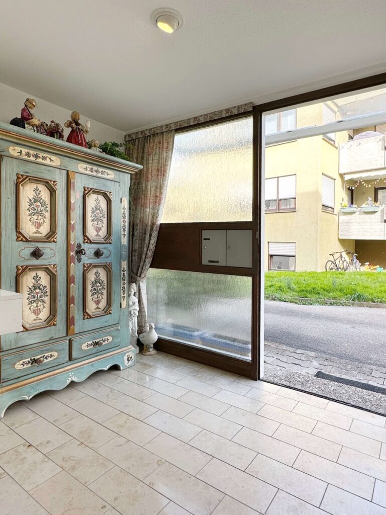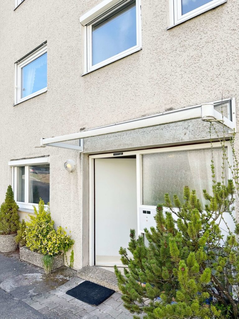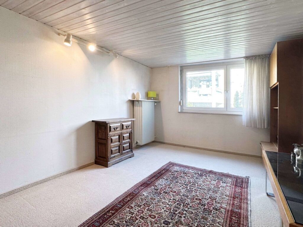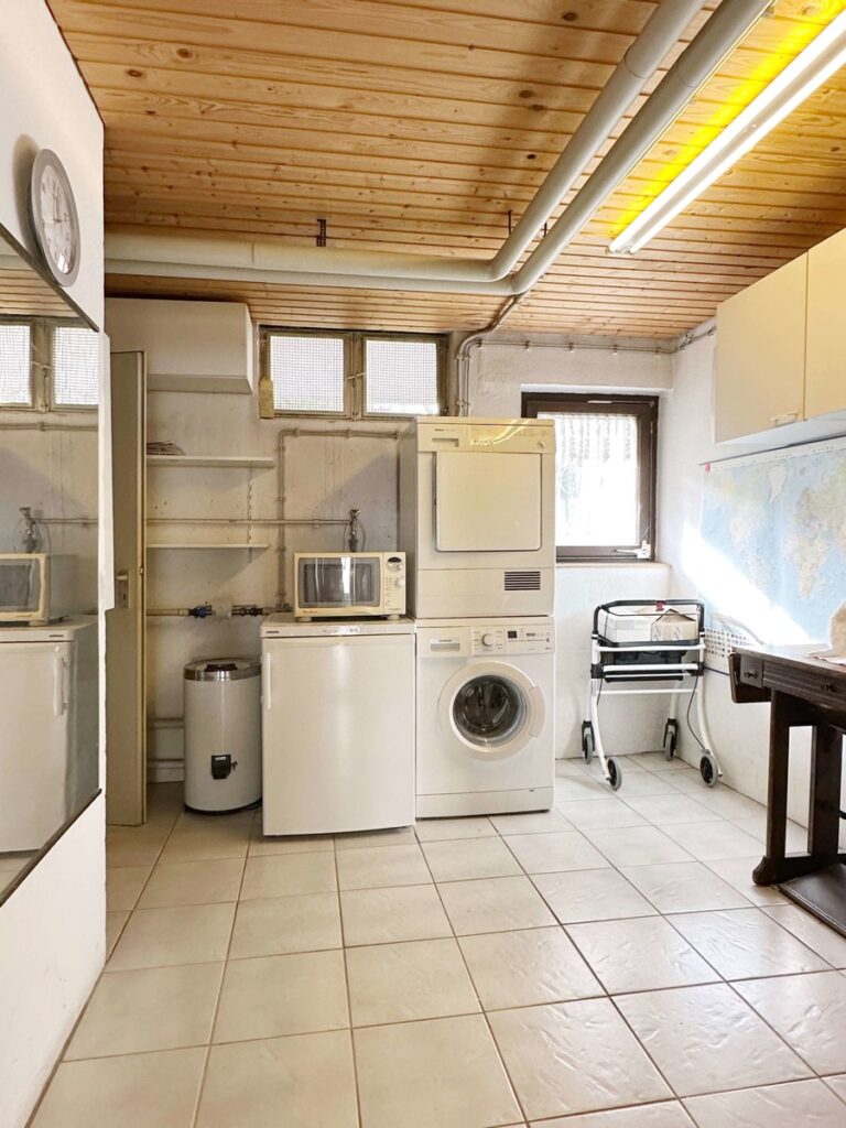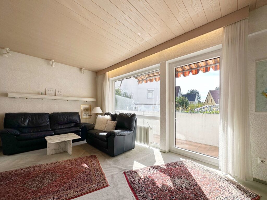 Beim Betreten des Hauses fällt der großzügige Windfang auf, der ausreichend Platz für eine Garderobe bietet. Im Erdgeschoss befindet sich der großzügige Hobbyraum der vielseitig genutzt werden kann, zum Beispiel als Gäste- oder Arbeitszimmer. Dieser Raum ist in der Wohnflächenberechnung nicht berücksichtigt. Auch die Kellerräume und ein Wirtschaftsraum sowie die Gaszentralheizung sind im Erdgeschoss untergebracht. Über eine Treppe im Flur erreicht man in das erste Obergeschoss, wo sich das große, offene Wohnzimmer mit Essbereich befindet. Von hier aus ist auch die Küche zugänglich, die ebenfalls über den hellen Flur erreicht werden kann. Der überdachte Balkon bietet einen angenehmen Platz zum Entspannen, während man über ein paar Stufen direkt in den sonnigen Garten mit Terrasse gelangen kann, um den Tag ausklingen zu lassen. Auf dieser Ebene befindet sich auch ein Gäste-WC, das noch aus dem Ursprungsjahr stammt.