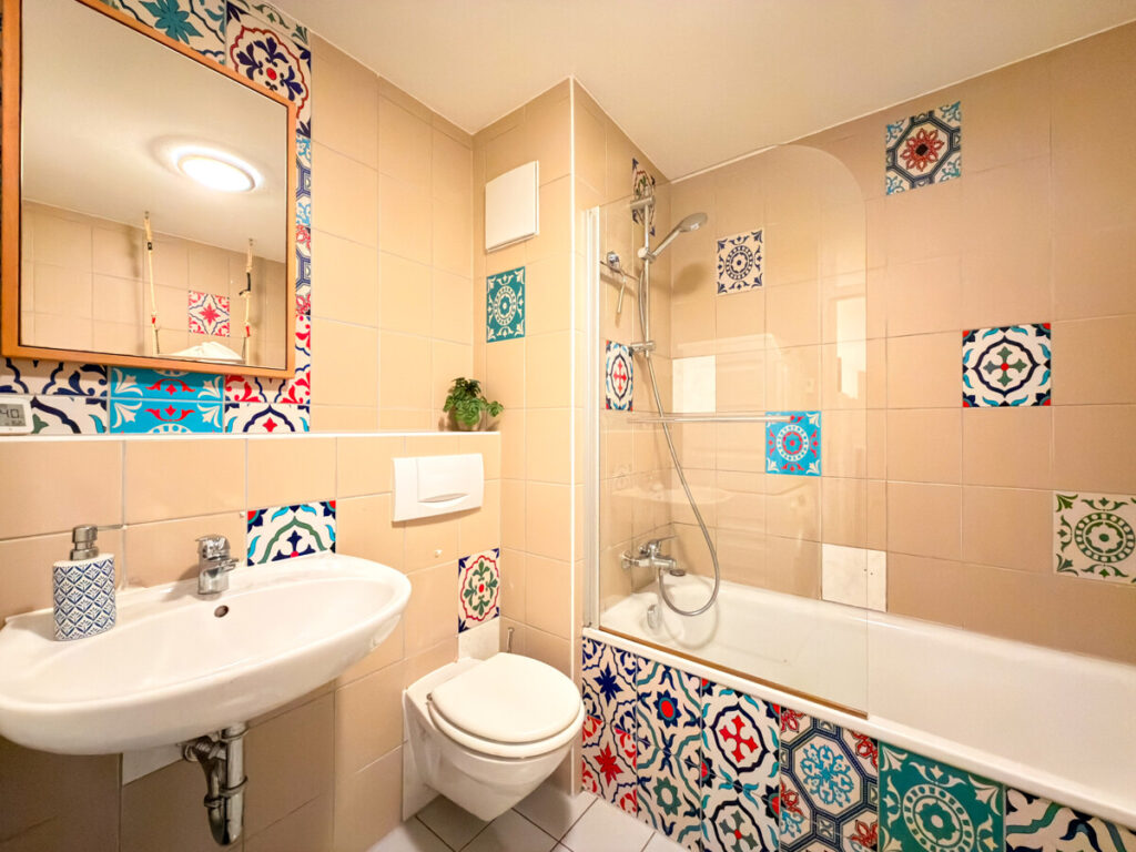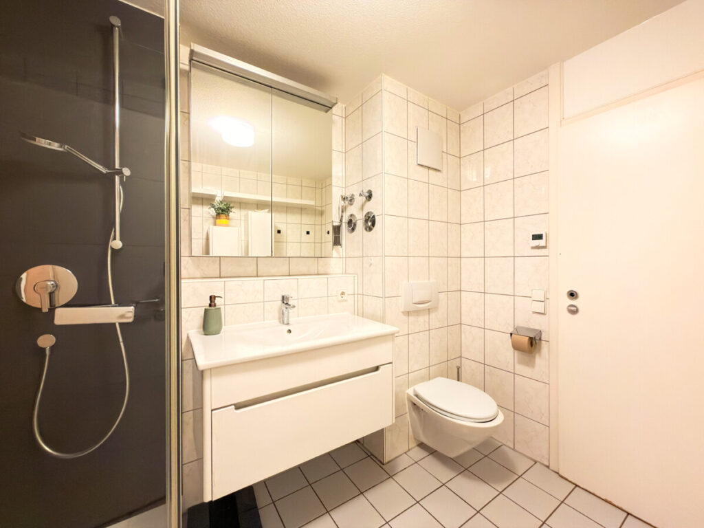 Auf dieser Ebene befindet sich außerdem ein zweites, vollständig ausgestattetes Badezimmer mit Badewanne, WC, Waschtisch und Waschmaschinenanschluss, das zusätzlichen Komfort und Flexibilität bietet.