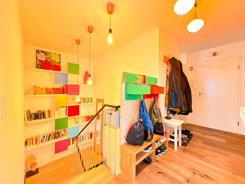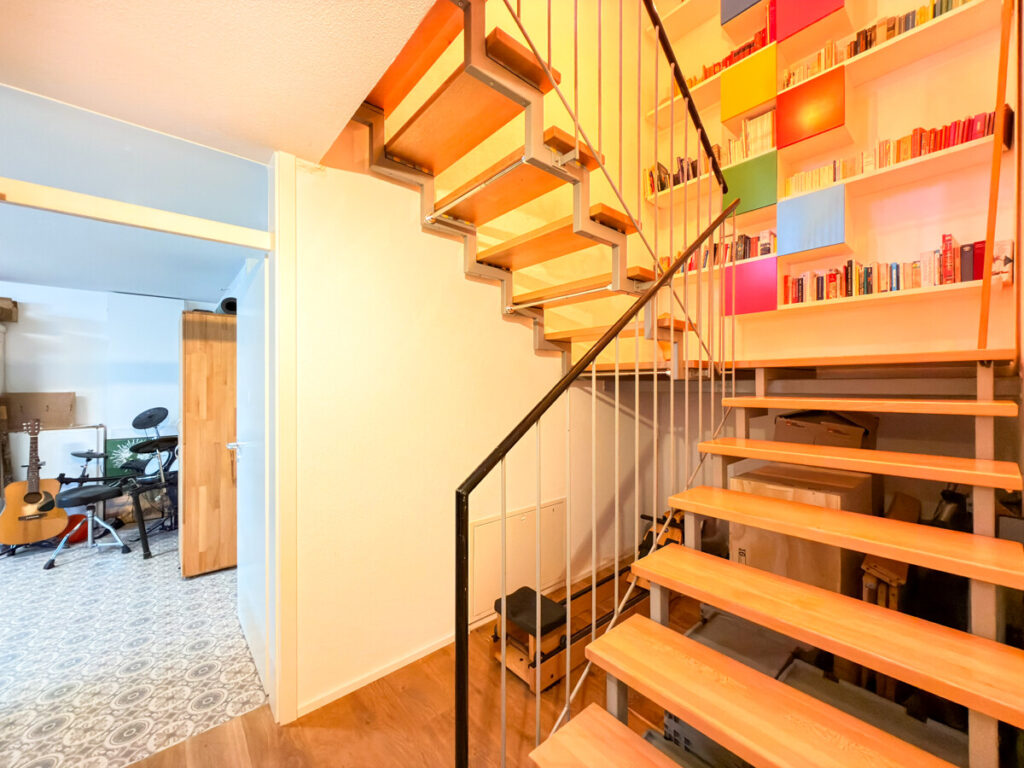 Über eine elegante Stahlwangentreppe mit Holzstufen gelangen Sie in das Untergeschoss der Maisonettewohnung. Hier erwarten Sie zwei weitere Räume, die sich als Schlafzimmer, Gästezimmer, Hobbyraum oder Homeoffice anbieten.
