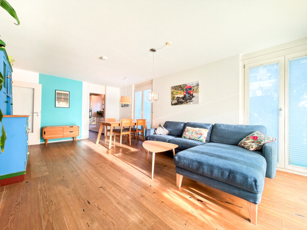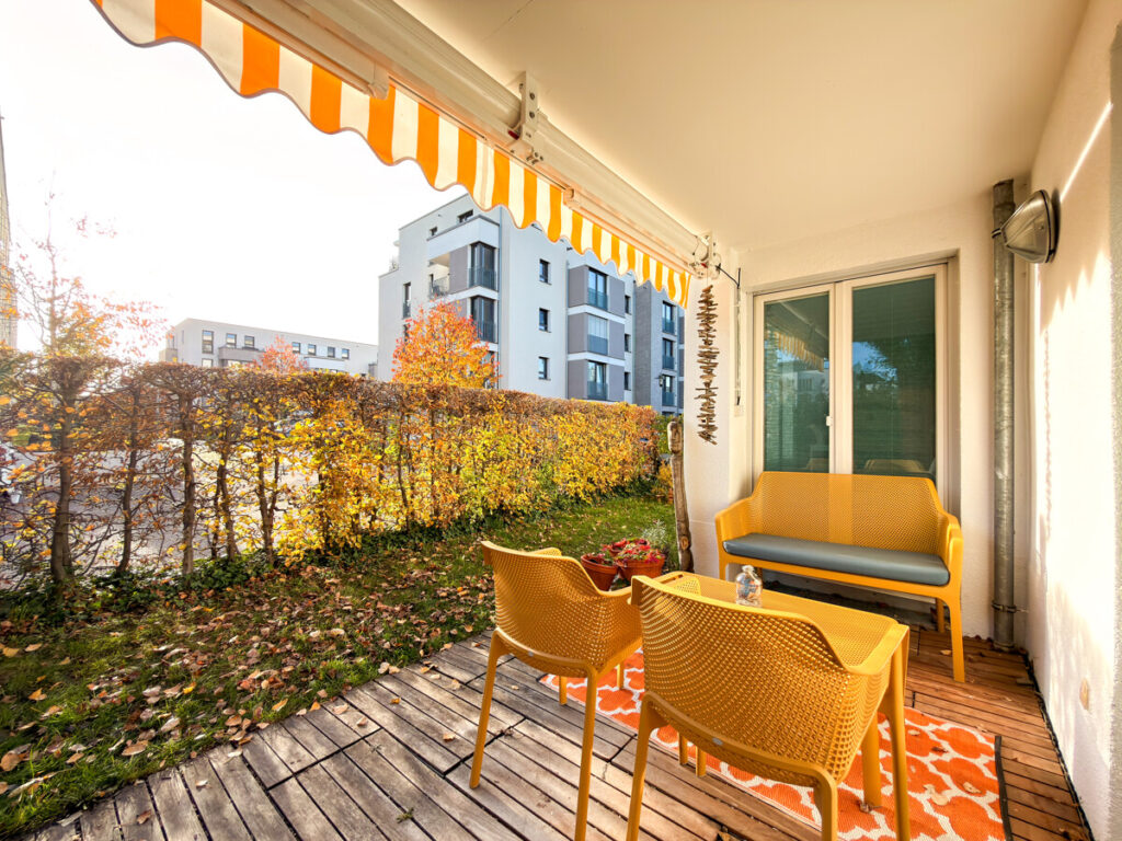 Bereits beim Betreten der Wohnung öffnet sich der Blick direkt in den lichtdurchfluteten Wohn- und Essbereich, der mit seiner freundlichen Atmosphäre und dem direkten Zugang auf die überdachte Terrasse mit privaten Gärtchen begeistert.