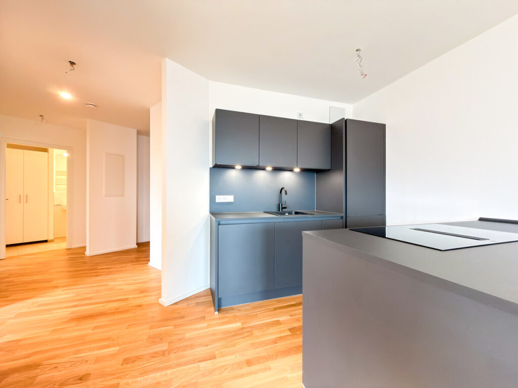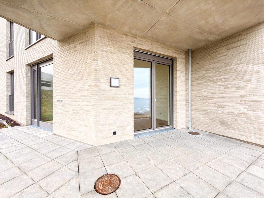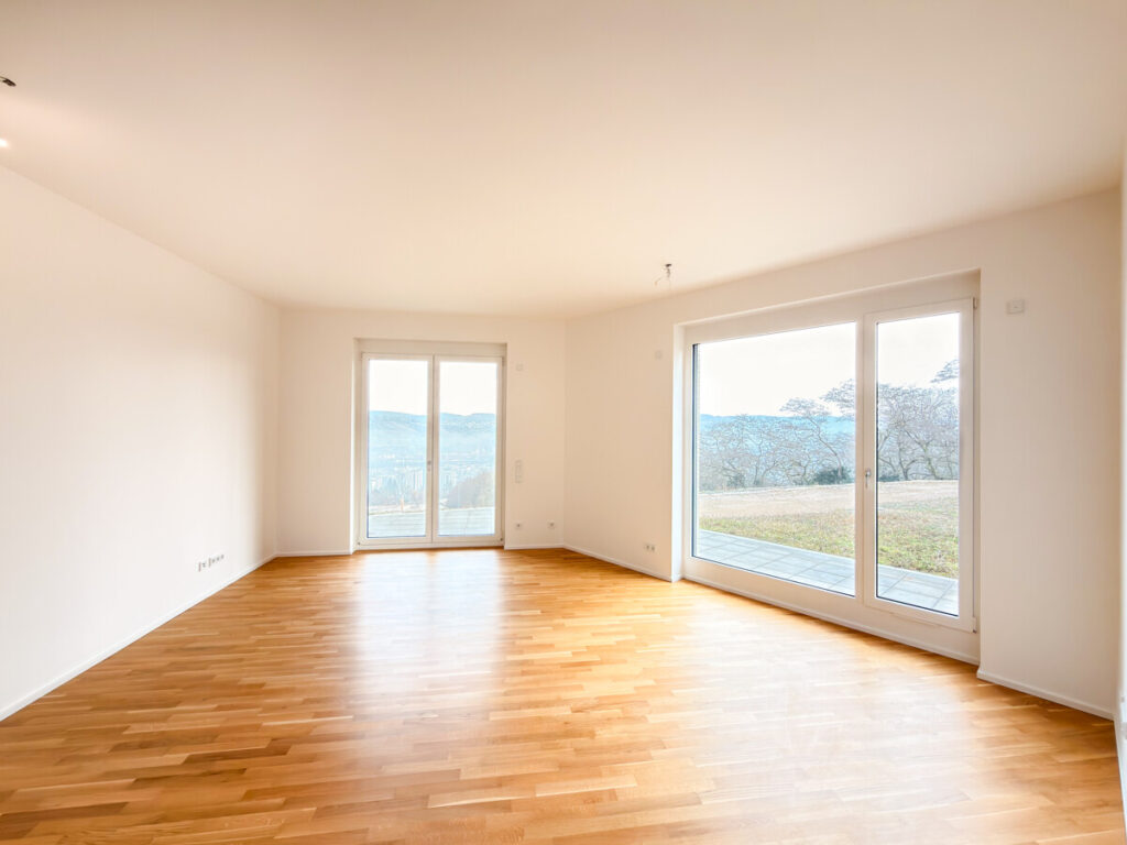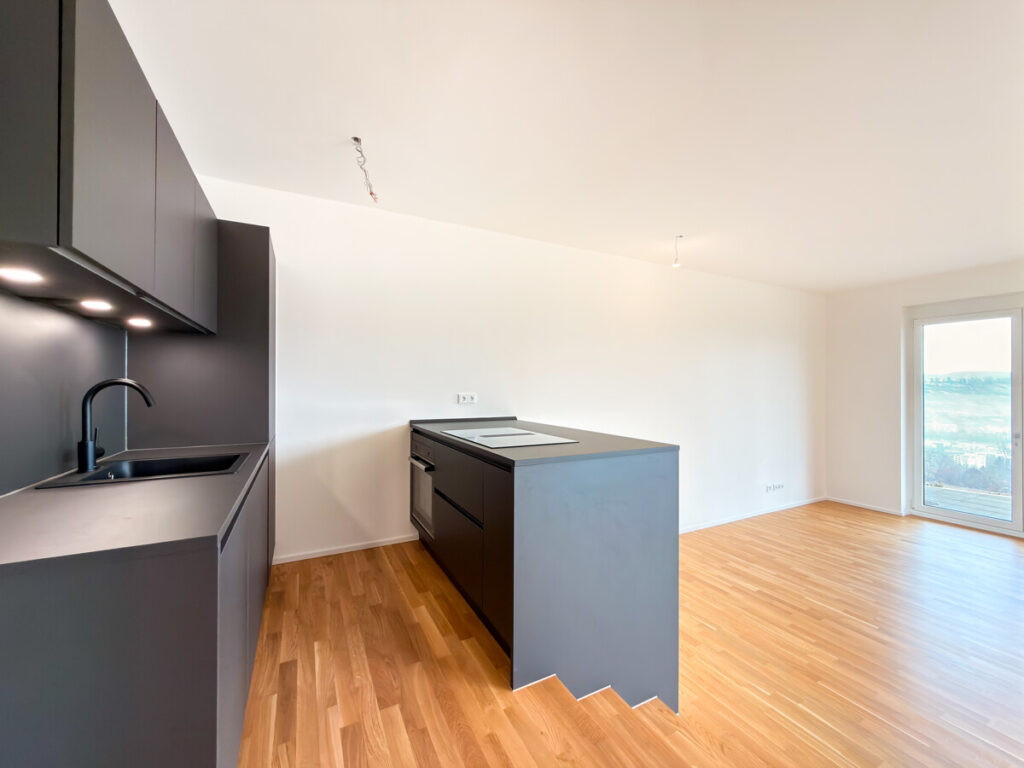 In einem modernen Neubau, der im September 2025 fertiggestellt wurde, erwartet Sie diese hochwertige Erdgeschosswohnung in begehrter Lage von Ostfildern – mit einem atemberaubenden Ausblick ins Grüne und über die Stadt. Beim Betreten der Wohnung gelangen Sie in einen großzügigen Eingangsbereich mit ausreichend Platz für Garderobe und Stauraum. Direkt anschließend öffnet sich der Blick auf die moderne, offene Küche in elegantem mattem Schwarz mit freistehender Kochinsel – ein echtes Highlight für Hobbyköche. Der lichtdurchflutete Wohn- und Essbereich besticht durch große Panoramafenster, eine Übereck-Terrasse mit Überdachung und eine beeindruckende Deckenhöhe von drei Metern. Der durchgehende Eiche-Parkettboden sorgt für ein warmes, hochwertiges Wohngefühl. Die Wohnung verfügt über zwei weitere Zimmer: ein Schlafzimmer mit französischem Balkon und bodentiefem Fenster sowie ein Arbeits- oder Kinderzimmer. Eine praktische Nische im Flurbereich wird mit maßgefertigten Schranktüren ausgestattet und dient künftig als integrierter Besenschrank mit zusätzlichem Stauraum. Für hohen Wohnkomfort sorgen zwei modern ausgestattete Bäder: • Badezimmer 1: WC, Badewanne mit künftig vorgesehener faltbarer Glasabtrennung (ideal auch zum komfortablen Duschen), Handtuchheizkörper, Waschtisch sowie Anschluss für Waschmaschine und Trockner. • Badezimmer 2: WC, Dusche und Waschtisch. Zur Wohnung gehören ein Tiefgaragenstellplatz, ein Kellerraum sowie der komfortable Zugang über den Aufzug. Ein Hausmeisterservice ist selbstverständlich vorhanden. Hochwertige Ausstattungsdetails wie elektrische Rollläden runden dieses attraktive Angebot ab. Diese Neubauwohnung vereint modernen Komfort, großzügige Raumaufteilung und eine einmalige Aussicht – ideal für anspruchsvolle Mieter, die stilvolles Wohnen in ruhiger, dennoch urbaner Lage schätzen.