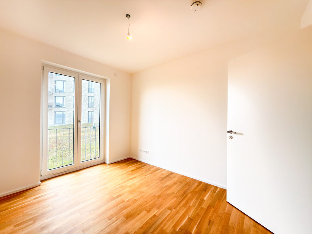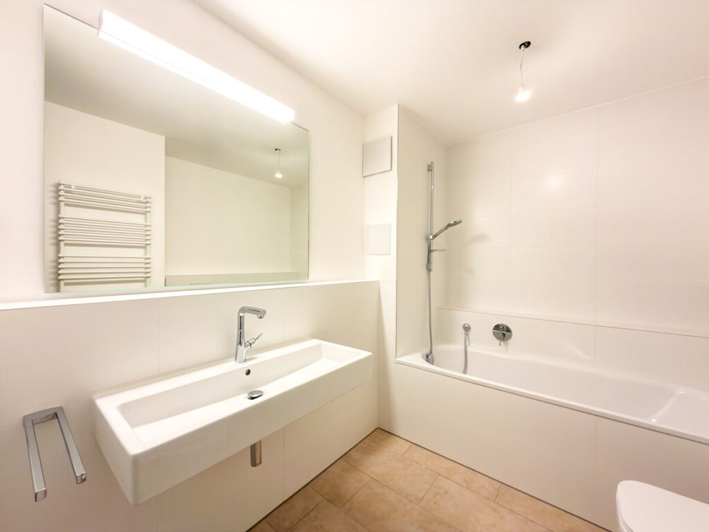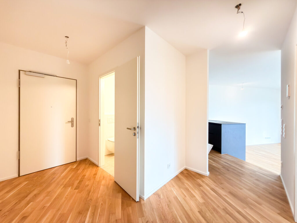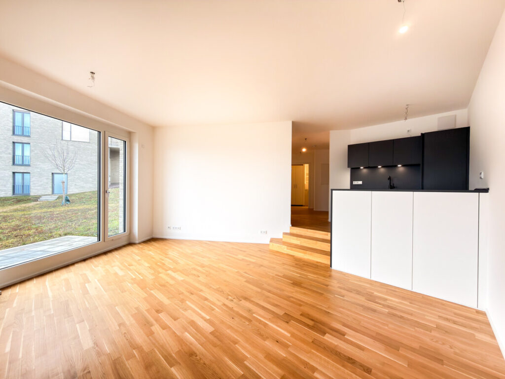 In einem modernen Neubau, der im September 2025 fertiggestellt wurde, erwartet Sie diese hochwertige Erdgeschosswohnung in begehrter Lage von Ostfildern – mit einem atemberaubenden Ausblick ins Grüne und über die Stadt. Beim Betreten der Wohnung gelangen Sie in einen großzügigen Eingangsbereich mit ausreichend Platz für Garderobe und Stauraum. Direkt anschließend öffnet sich der Blick auf die moderne, offene Küche in elegantem mattem Schwarz mit freistehender Kochinsel – ein echtes Highlight für Hobbyköche. Der lichtdurchflutete Wohn- und Essbereich besticht durch große Panoramafenster, eine Übereck-Terrasse mit Überdachung und eine beeindruckende Deckenhöhe von drei Metern. Der durchgehende Eiche-Parkettboden sorgt für ein warmes, hochwertiges Wohngefühl. Die Wohnung verfügt über zwei weitere Zimmer: ein Schlafzimmer mit französischem Balkon und bodentiefem Fenster sowie ein Arbeits- oder Kinderzimmer. Eine praktische Nische im Flurbereich wird mit maßgefertigten Schranktüren ausgestattet und dient künftig als integrierter Besenschrank mit zusätzlichem Stauraum. Für hohen Wohnkomfort sorgen zwei modern ausgestattete Bäder: • Badezimmer 1: WC, Badewanne mit künftig vorgesehener faltbarer Glasabtrennung (ideal auch zum komfortablen Duschen), Handtuchheizkörper, Waschtisch sowie Anschluss für Waschmaschine und Trockner. • Badezimmer 2: WC, Dusche und Waschtisch. Zur Wohnung gehören ein Tiefgaragenstellplatz, ein Kellerraum sowie der komfortable Zugang über den Aufzug. Ein Hausmeisterservice ist selbstverständlich vorhanden. Hochwertige Ausstattungsdetails wie elektrische Rollläden runden dieses attraktive Angebot ab. Diese Neubauwohnung vereint modernen Komfort, großzügige Raumaufteilung und eine einmalige Aussicht – ideal für anspruchsvolle Mieter, die stilvolles Wohnen in ruhiger, dennoch urbaner Lage schätzen.
