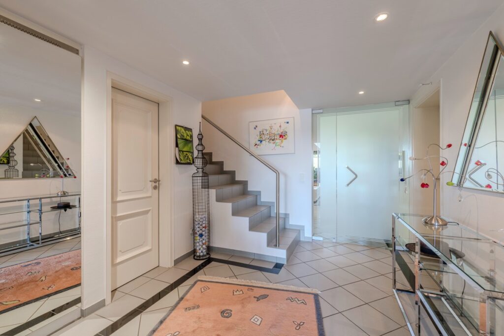 Im Erdgeschoss empfängt Sie ein einladender, offener Eingangsbereich mit viel Platz für eine stilvolle Garderobe. Ein modernes Gäste-WC und der Treppenaufgang ins Dachgeschoss befinden sich in diesem Bereich. Der angrenzende Wohnbereich beeindruckt durch Großzügigkeit, Licht und architektonische Raffinesse. Mehrere Rückzugszonen schaffen behagliche Wohninseln – ideal zum Entspannen, Genießen und Ankommen.