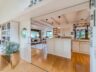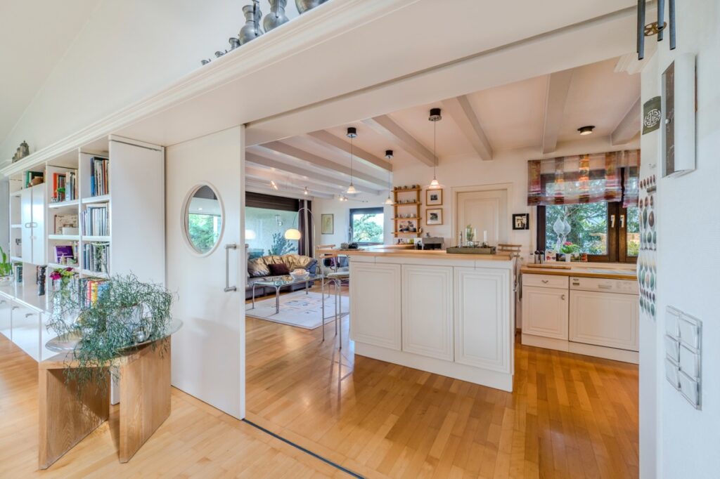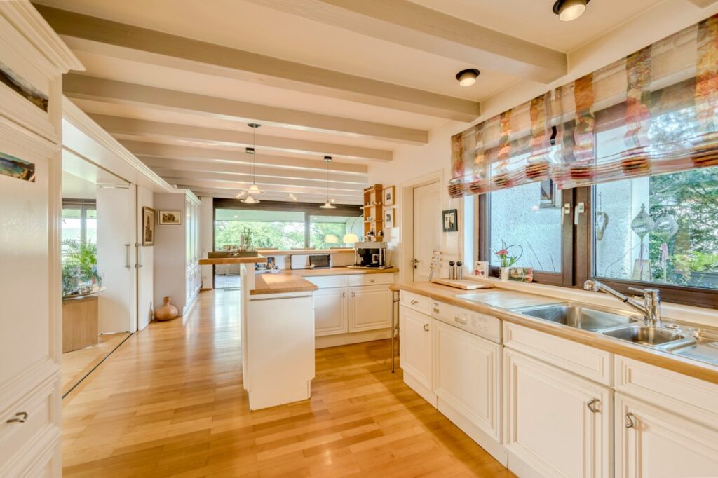 Zentral im Raum befindet sich ein stilvoller Kaminbereich, der über wenige Stufen erreichbar ist und zum Verweilen an kalten Abenden einlädt. Große Fensterfronten fluten den Raum mit Tageslicht und verbinden Innen- mit Außenraum auf harmonische Weise. Die offen gestaltete Küche mit hochwertiger Einbauküche und angrenzender Speisekammer ist der perfekte Ort für gesellige Stunden mit Familie und Freunden.