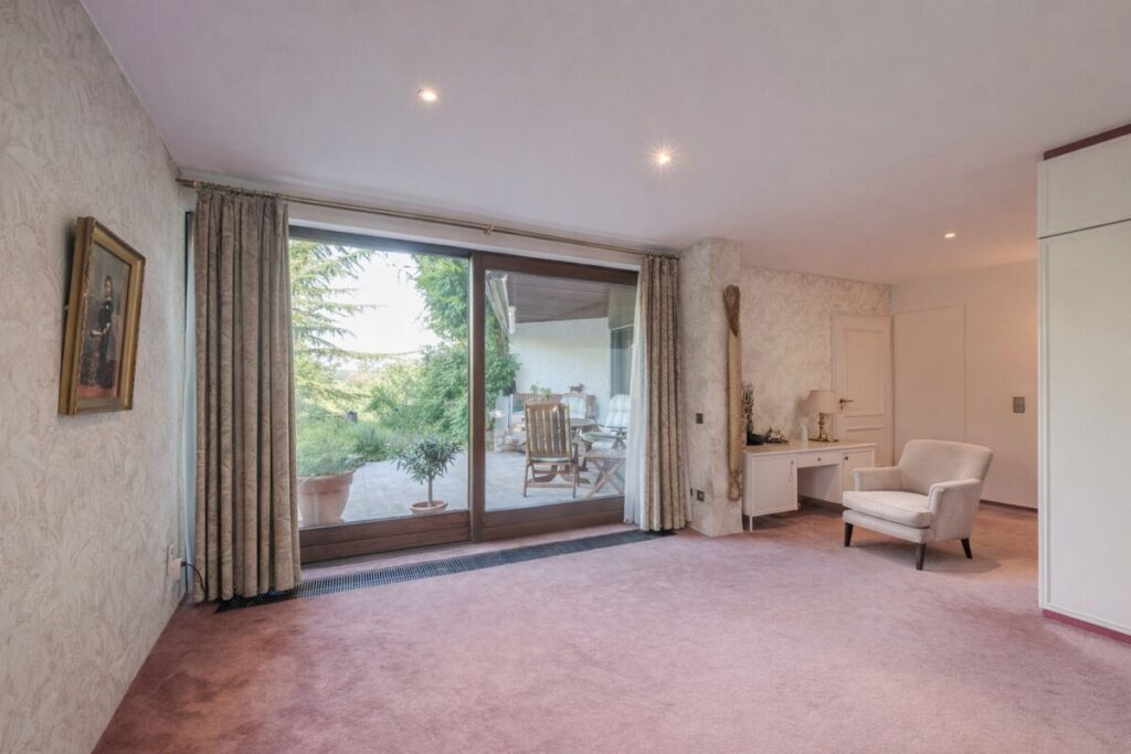 Von hier aus gelangen Sie auf eine überdachte Loggia mit traumhaftem Blick ins Grüne – ein idealer Ort für den Morgenkaffee oder laue Sommerabende. Ebenfalls vom Kaminbereich aus zugänglich ist eine weitläufige Terrasse, die durch einen idyllischen Teich, üppige Bepflanzung und angrenzenden Gartenbereich eine grüne Oase der Ruhe bildet. Ein weiteres Highlight auf dieser Ebene ist das großzügige Schlafzimmer mit separater Ankleide, direktem Zugang zur Terrasse sowie einem eigenen Badezimmer. Ein praktischer Hauswirtschaftsraum rundet das Raumangebot im Erdgeschoss ab. Er bietet viel Stauraum, Anschlüsse für Waschmaschine und Trockner, maßgefertigte Einbauschränke sowie einen direkten Zugang zum überdachten Außenbereich und zur Doppelgarage.