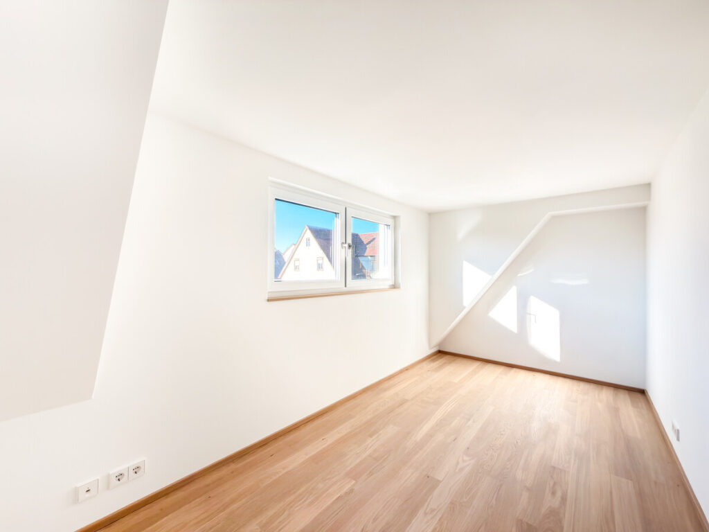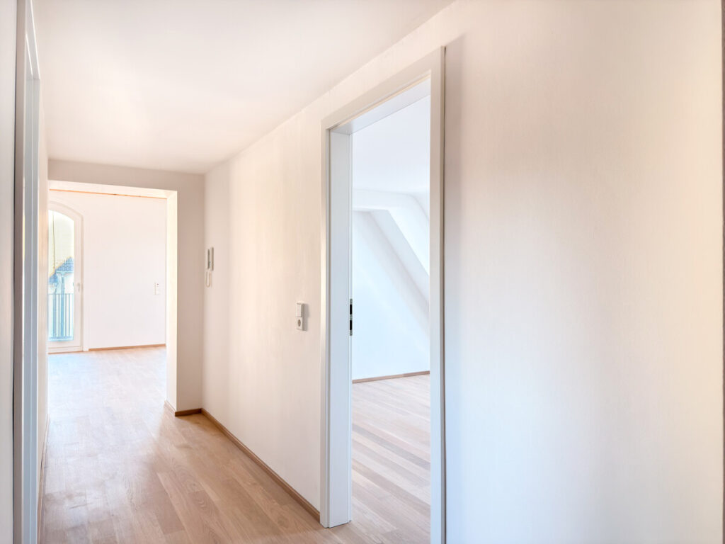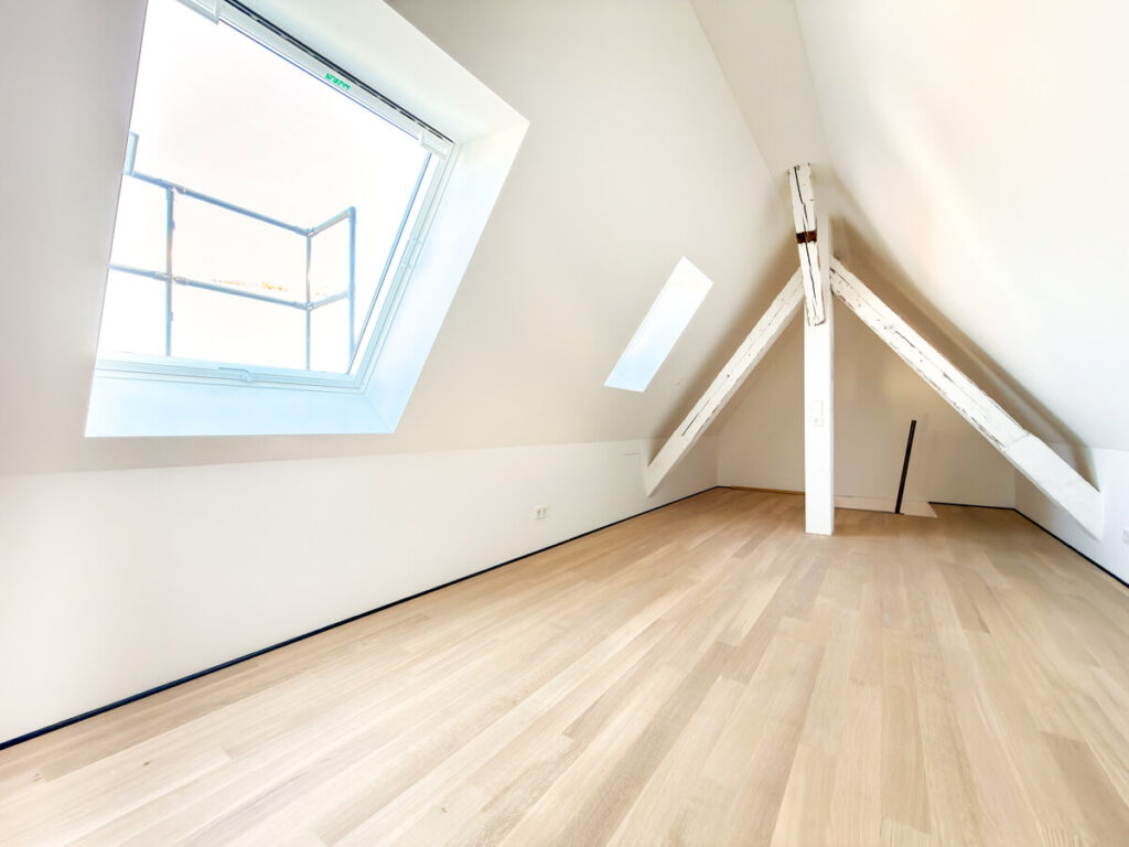 Der lichtdurchflutete Wohn-, Ess- und Kochbereich bildet das Herzstück der Wohnung. Sichtbare, weiß lackierte Dachbalken, elegante Dachschrägen und die darüberliegende Galerieebene verleihen dem Raum eine besondere architektonische Tiefe. Die Galerie eignet sich ideal als Kinder-, Arbeits-, oder Rückzugsbereich und kann bei Bedarf durch eine Schiebetür vollständig abgetrennt werden.