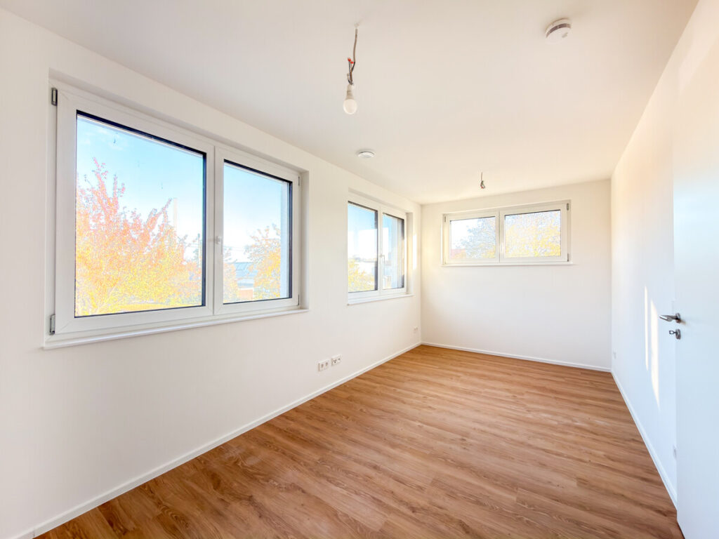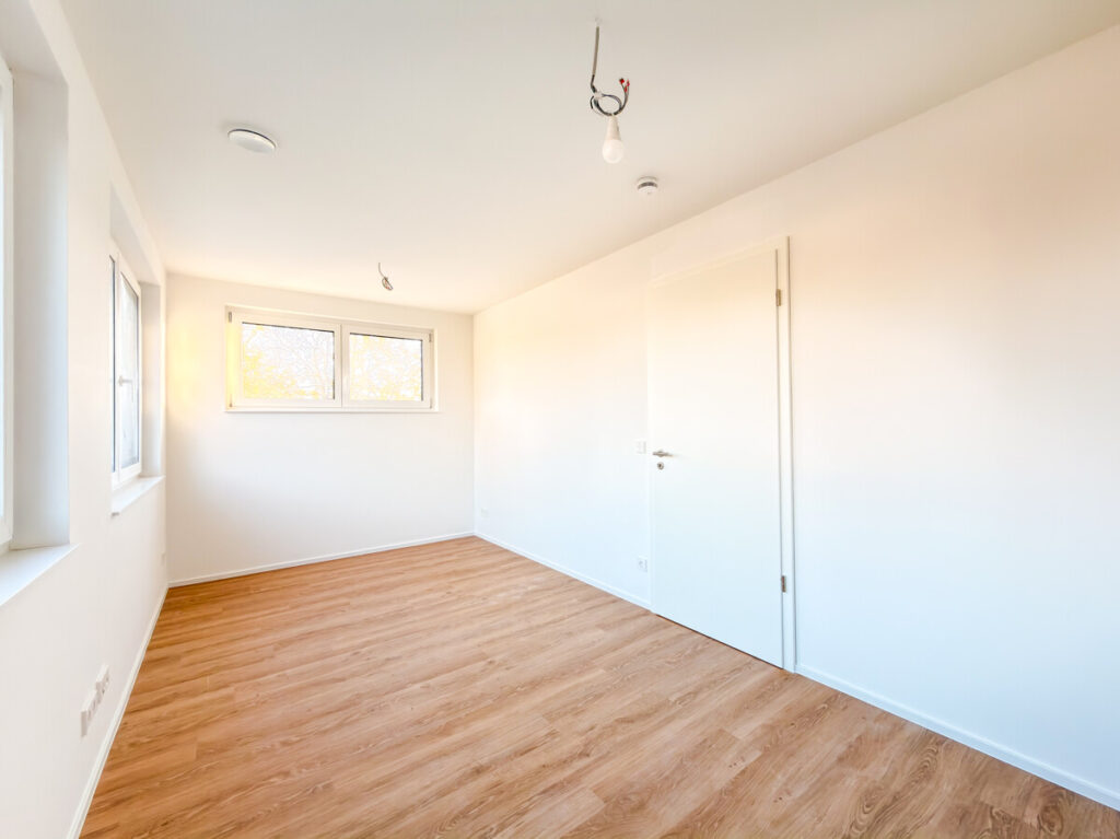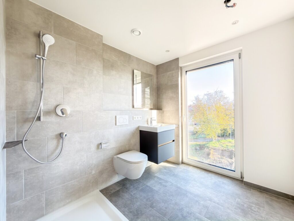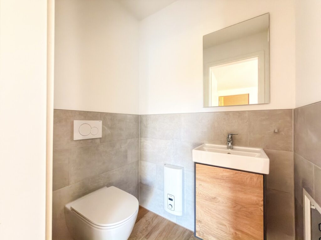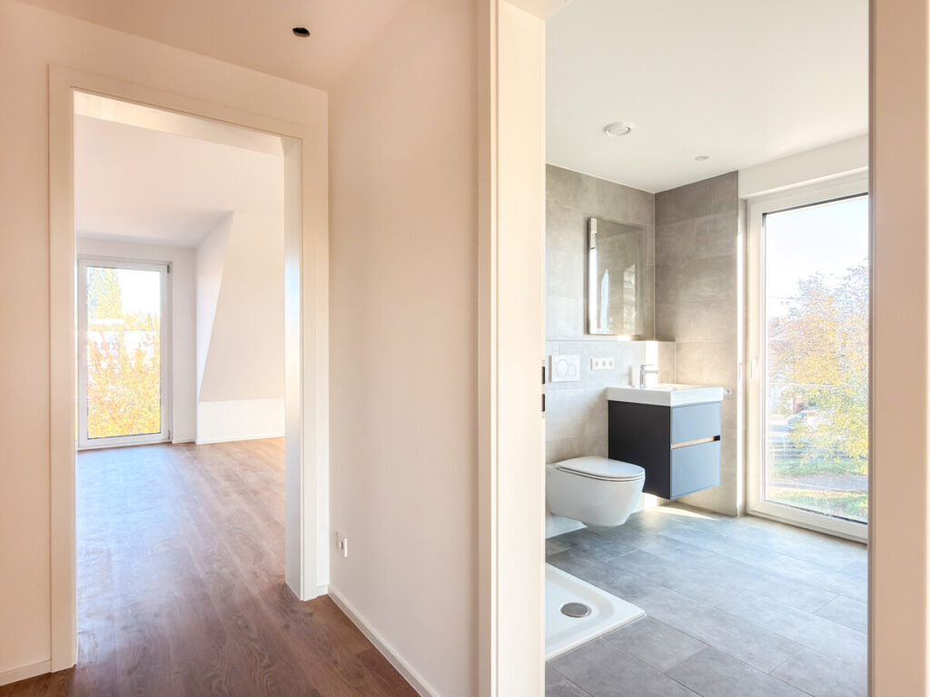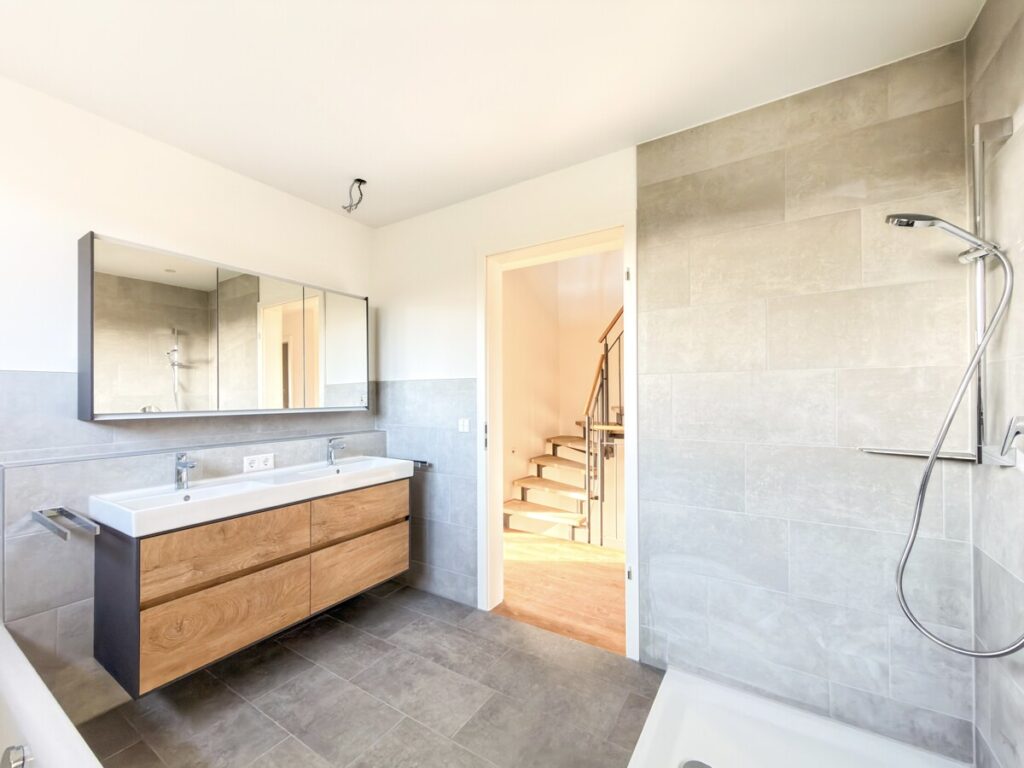 Im 1. Obergeschoss befinden sich zwei helle, gut geschnittene Zimmer, ein Technikraum, ein Abstellraum sowie das luxuriöse Tageslichtbad. Dieses ist mit edlem Feinsteinzeug, einer Badewanne, einer begehbaren Dusche, einem Doppelwaschtisch mit Unterschrank und einem Spiegelschrank ausgestattet – ein echtes Wohlfühlbad mit viel Platz und Stil.