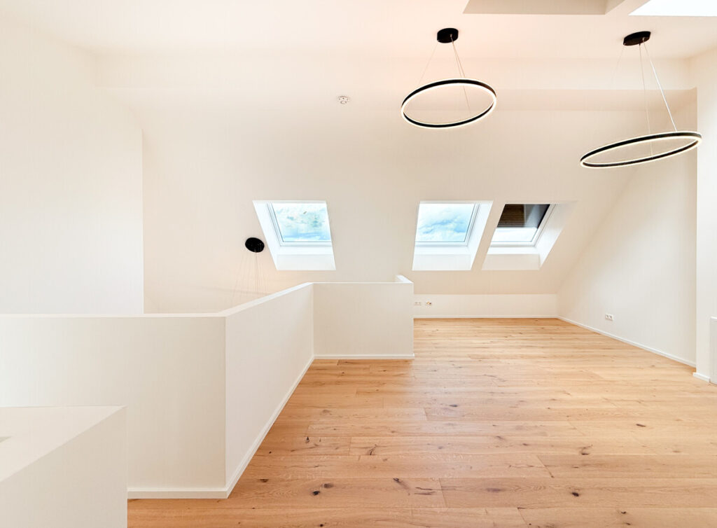Über eine moderne Stahlwangentreppe mit edlen Eichenstufen gelangt man in das obere Geschoss. Hier eröffnet sich ein weitläufiger Wohnbereich, der durch die charmanten Schrägen und großzügigen Dachfenster eine einzigartige Atmosphäre erhält. Eine stilvolle Arbeitsnische lässt sich ebenfalls hervorragend integrieren.