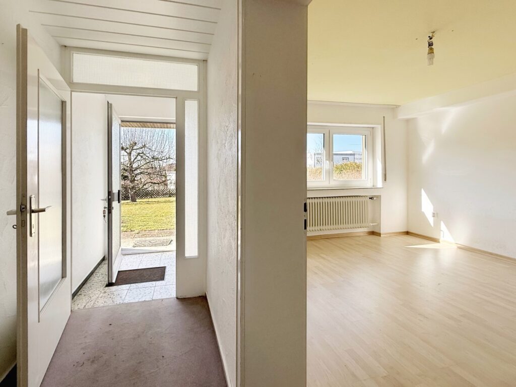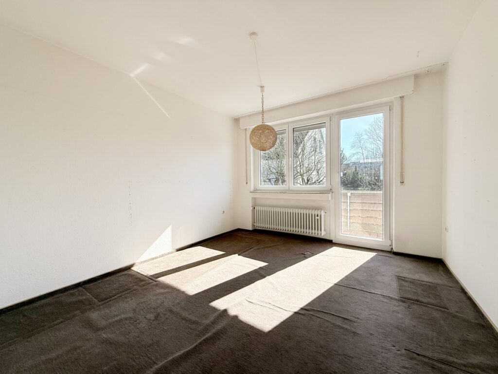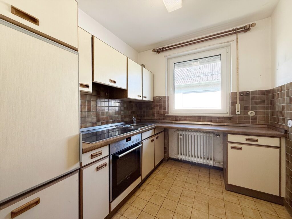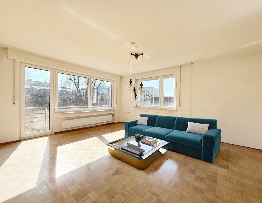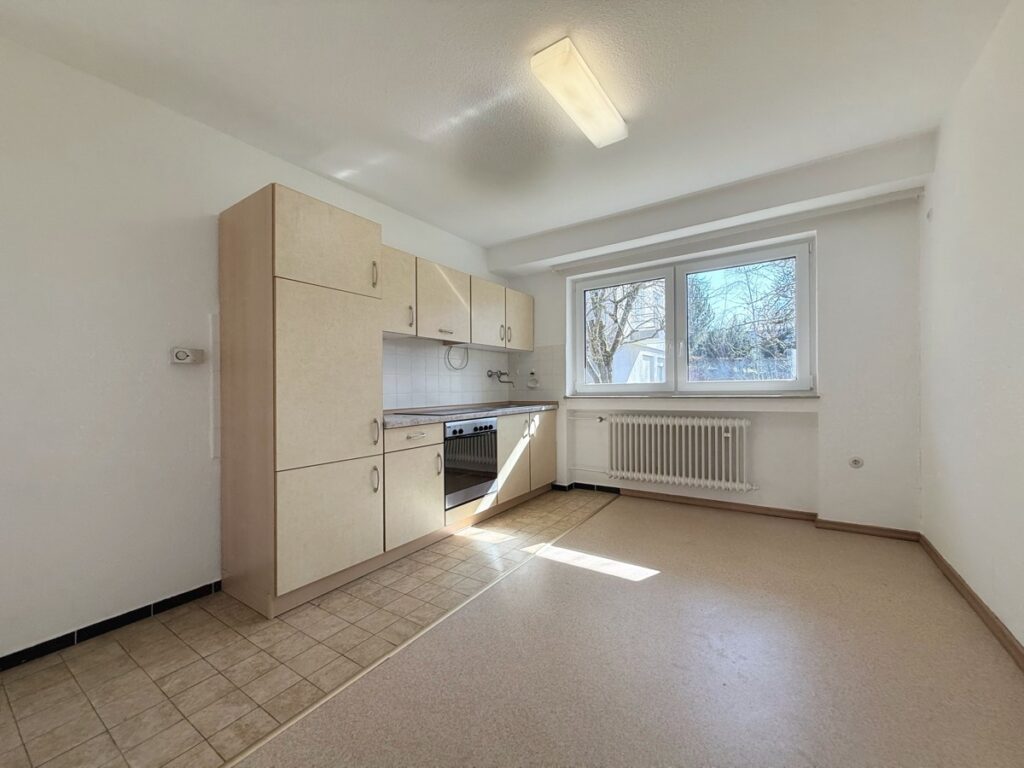 Das lichtdurchflutete Wohn- und Esszimmer beeindruckt mit einer großen Fensterfront, die einen herrlichen Blick in den Garten bietet, und einem direkten Zugang zum Balkon. Angrenzend befindet sich die funktionale Küche mit einer gepflegten, älteren Einbauküche und einer praktischen Speisekammer.