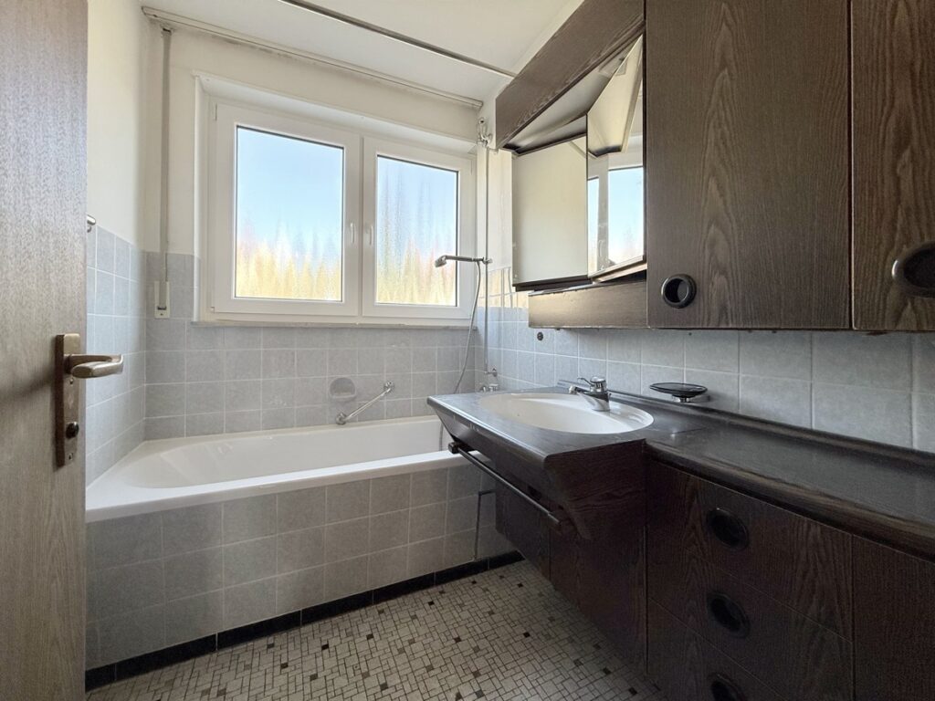 Diese Wohnebene bietet zudem drei flexibel nutzbare Zimmer – ideal als Schlaf-, Kinder- oder Arbeitszimmer. Der Wohn- und Essbereich ist mit edlem Parkett ausgestattet, das für eine warme Atmosphäre sorgt, während die übrigen Räume mit Fliesen oder Teppichboden versehen sind. Ein Tageslichtbad mit Badewanne und Waschtisch sowie ein separates WC runden das Raumangebot dieser Etage ab.
