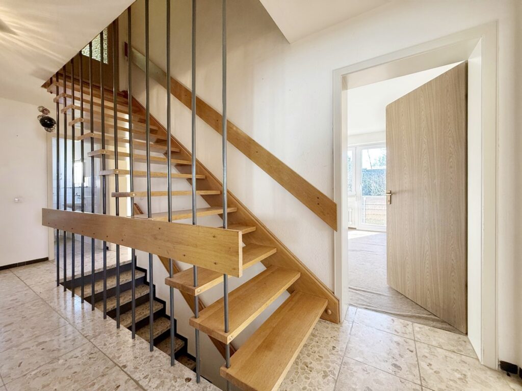 Vor dem Haus erwartet Sie ein wunderschön angelegter Vorgarten, der das einladende Gesamtbild abrundet. Direkt daneben befindet sich die Garage mit einem zusätzlichen Stellplatz davor. Beim Betreten des Hauses empfängt Sie ein geräumiger Windfang mit Platz für eine Garderobe, der nahtlos in die großzügige Diele mit offenem Treppenhaus übergeht.