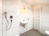 Rechter Hand befindet sich das modern sanierte Badezimmer, ausgestattet mit einer komfortablen Dusche, stilvollem Waschtisch, WC sowie einem praktischen Handtuchheizkörper. Direkt daneben liegt die gut geschnittene Küche, die durch clever integrierten Stauraum im Kniestock zusätzlichen Platz für Vorräte oder Haushaltsutensilien bietet.