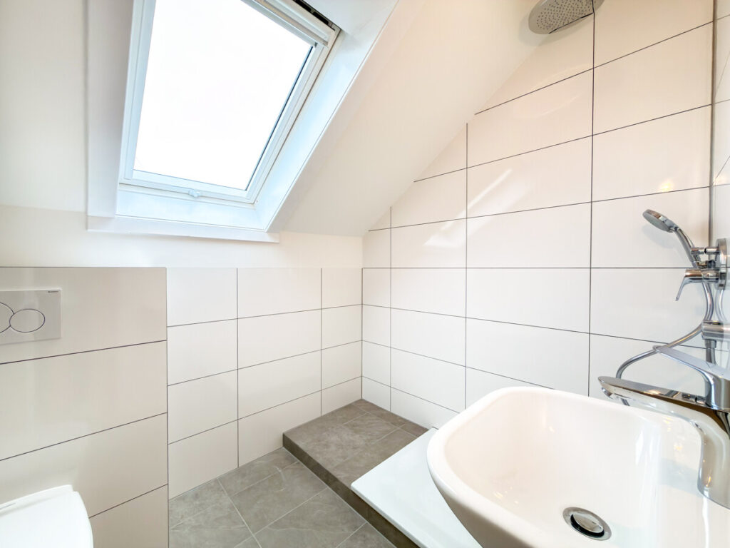Rechter Hand befindet sich das modern sanierte Badezimmer, ausgestattet mit einer komfortablen Dusche, stilvollem Waschtisch, WC sowie einem praktischen Handtuchheizkörper. Direkt daneben liegt die gut geschnittene Küche, die durch clever integrierten Stauraum im Kniestock zusätzlichen Platz für Vorräte oder Haushaltsutensilien bietet.