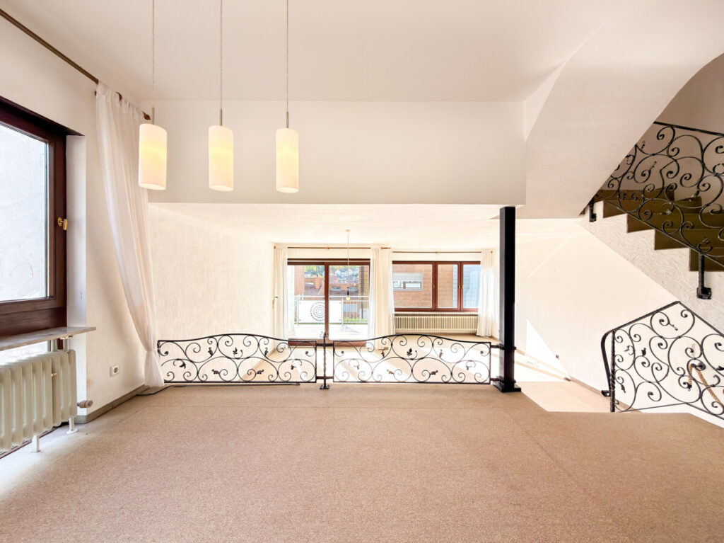 Schon beim Betreten des Hauses empfängt Sie ein einladender Windfang mit Platz für Garderobe und Schuhe. Von hier öffnet sich der großzügige Ess- und Wohnbereich im beliebten Split-Level-Stil – ein architektonisches Highlight, das dem Haus seinen unverwechselbaren Charakter verleiht.