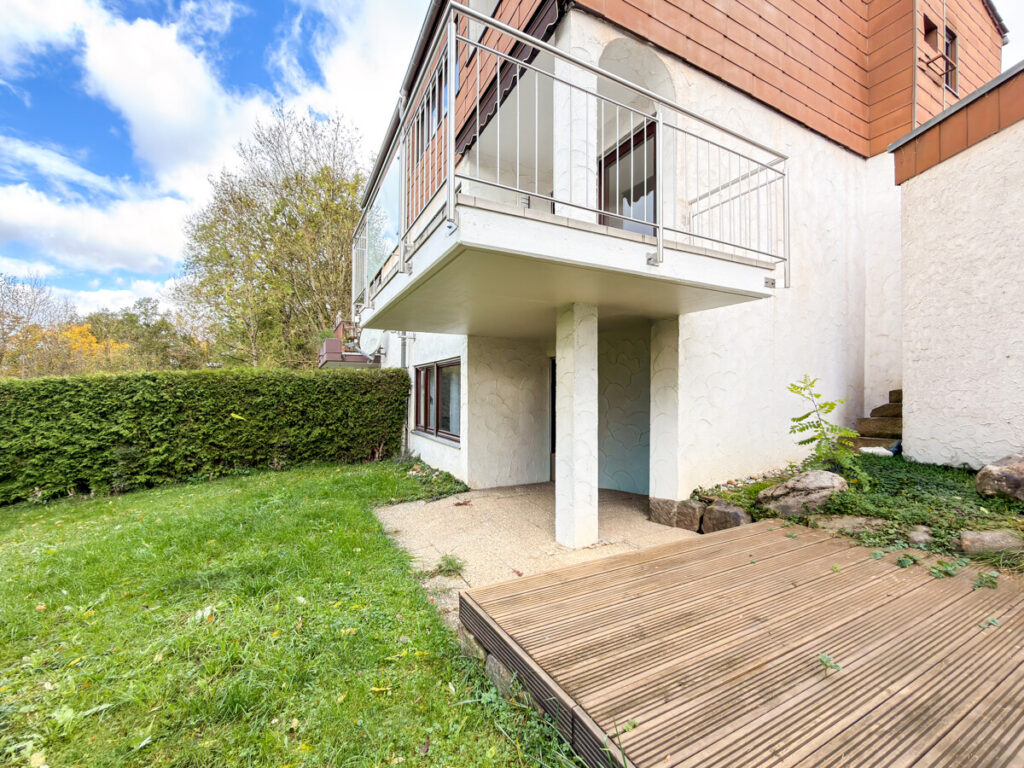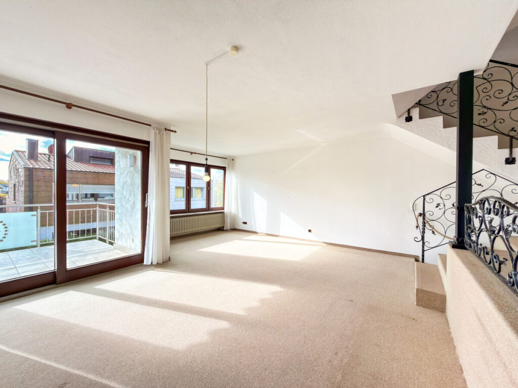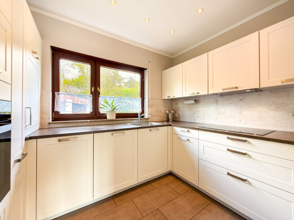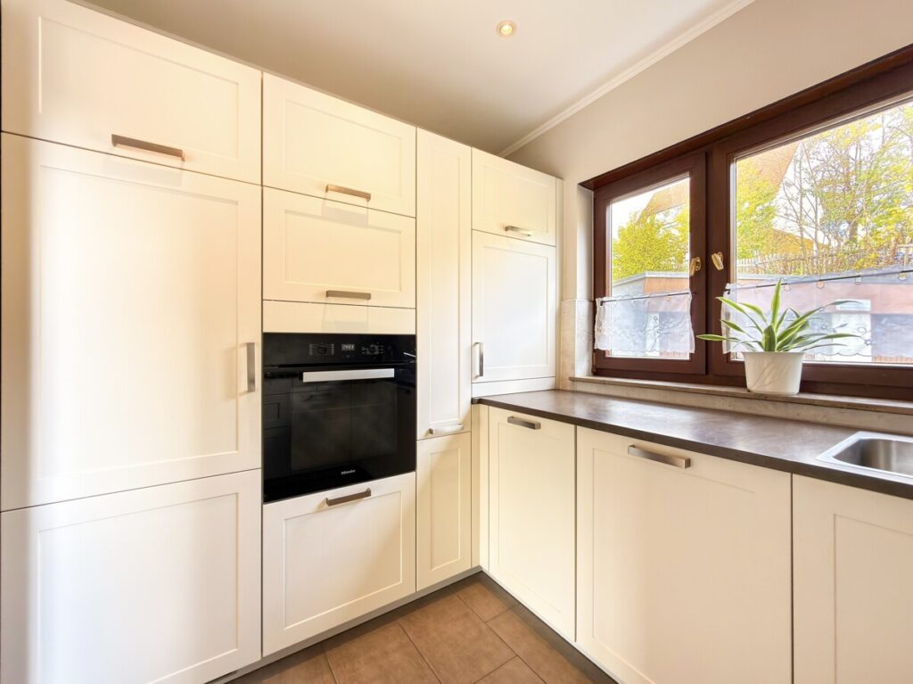 Die helle, moderne Einbauküche ist optimal in den Essbereich integriert und bietet den perfekten Rahmen für gemeinsame Koch- und Genussmomente. Über wenige Stufen erreichen Sie den gemütlichen Wohnbereich, der dank großer Fensterflächen lichtdurchflutet ist und direkten Zugang auf den sonnigen Balkon bietet. Hier genießen Sie entspannte Stunden mit schönem Gartenblick; eine Markise sorgt an heißen Tagen für angenehmen Schatten.