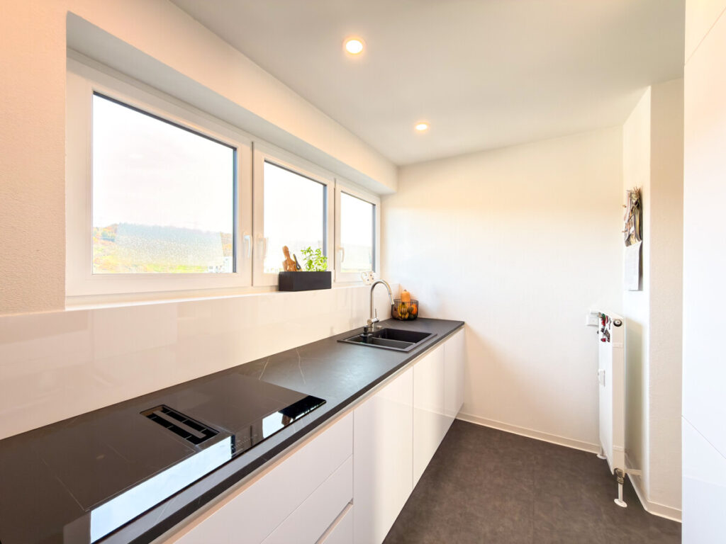 Die hochwertige Küche lädt zum Kochen und Genießen ein, während ein weiteres Zimmer flexibel als Gäste-, Arbeits- oder Hobbyraum genutzt werden kann. Das großzügige Wohn- und Esszimmer beeindruckt durch seine Weitläufigkeit und bietet direkten Zugang zum teilüberdachten Balkon mit Markise – der perfekte Ort, um den Tag entspannt ausklingen zu lassen oder sonnige Stunden zu genießen.
