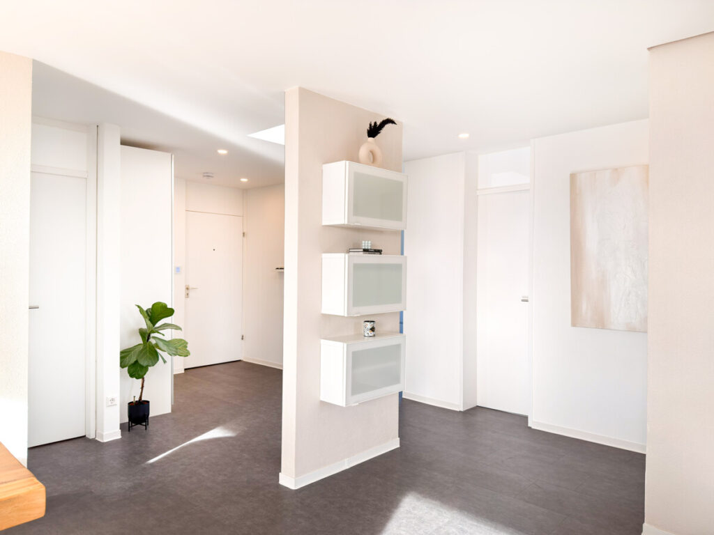 Willkommen in Ihrem neuen Zuhause – diese Penthouse Wohnung in einem großen Mehrfamilienhaus verbindet modernes Wohnen mit Komfort und lichtdurchfluteten Räumen. Schon beim Betreten empfängt Sie ein offener Flur, der eine einladende und elegante Atmosphäre schafft.