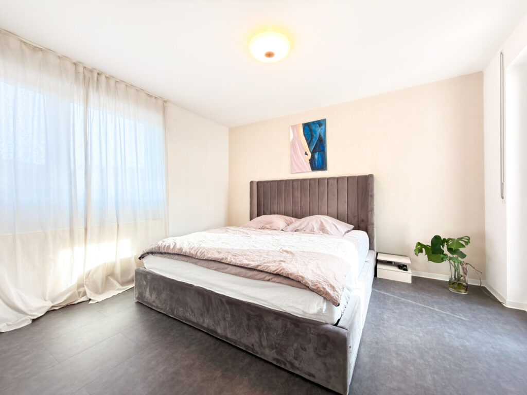 Das helle Tageslichtbad überzeugt mit moderner Dusche, stilvollem Waschtisch und praktischer Waschmaschine, ergänzt durch ein separates, ebenfalls lichtdurchflutetes Gäste-WC. Das Schlafzimmer ist ein Rückzugsort der Ruhe und Eleganz und verfügt ebenfalls über direkten Balkonzugang.