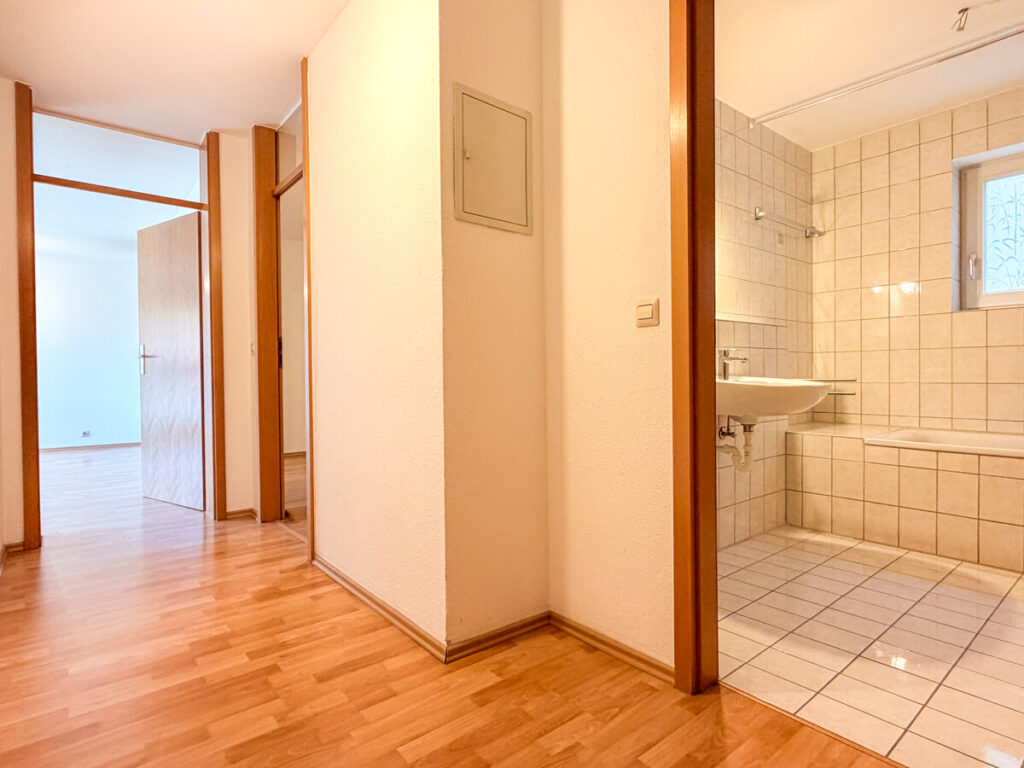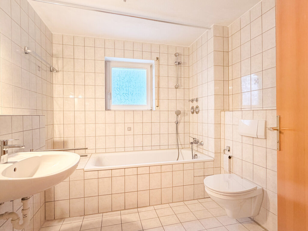Das Tageslichtbad ist hell gefliest und verfügt über eine Badewanne, einen Waschtisch, einen Waschmaschinenanschluss und ein WC. In der gesamten Wohnung ist heller Laminatboden verlegt, der das freundliche Gesamtbild unterstreicht.