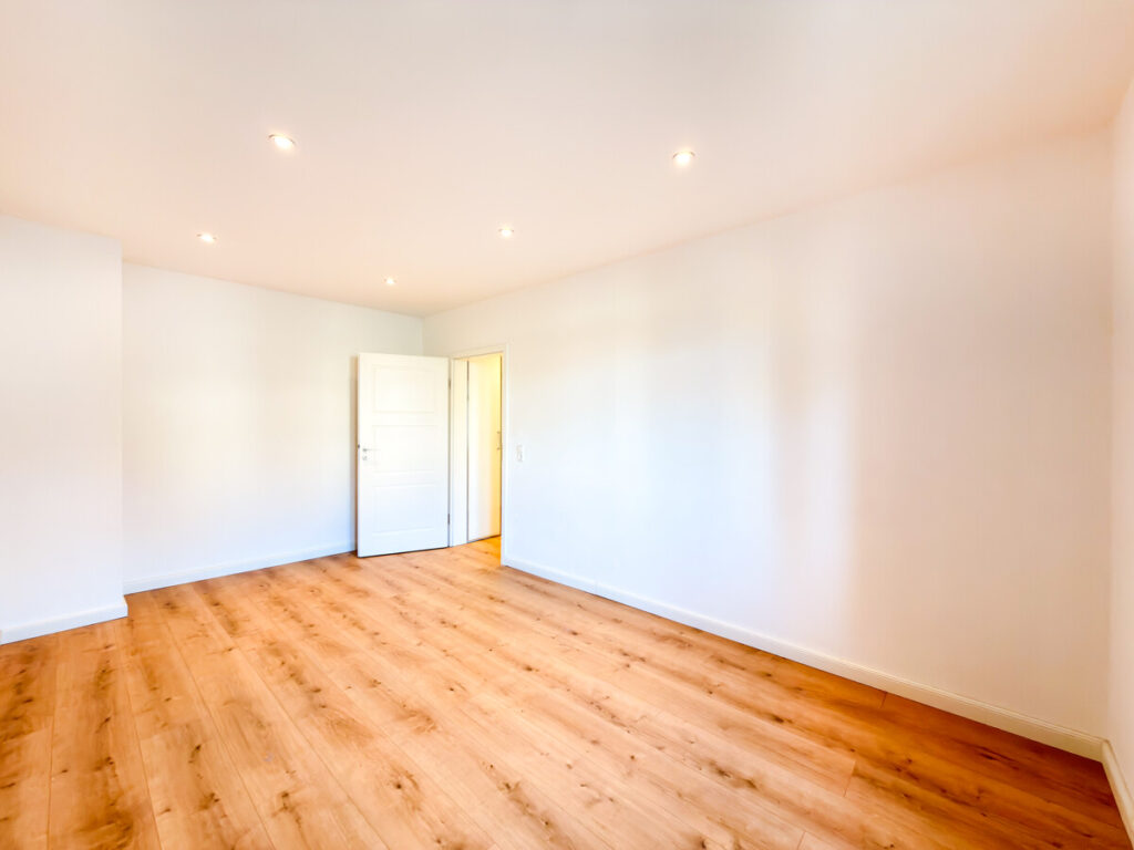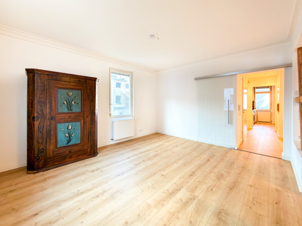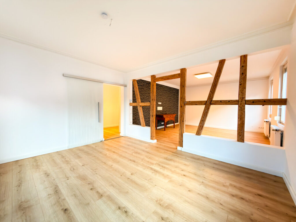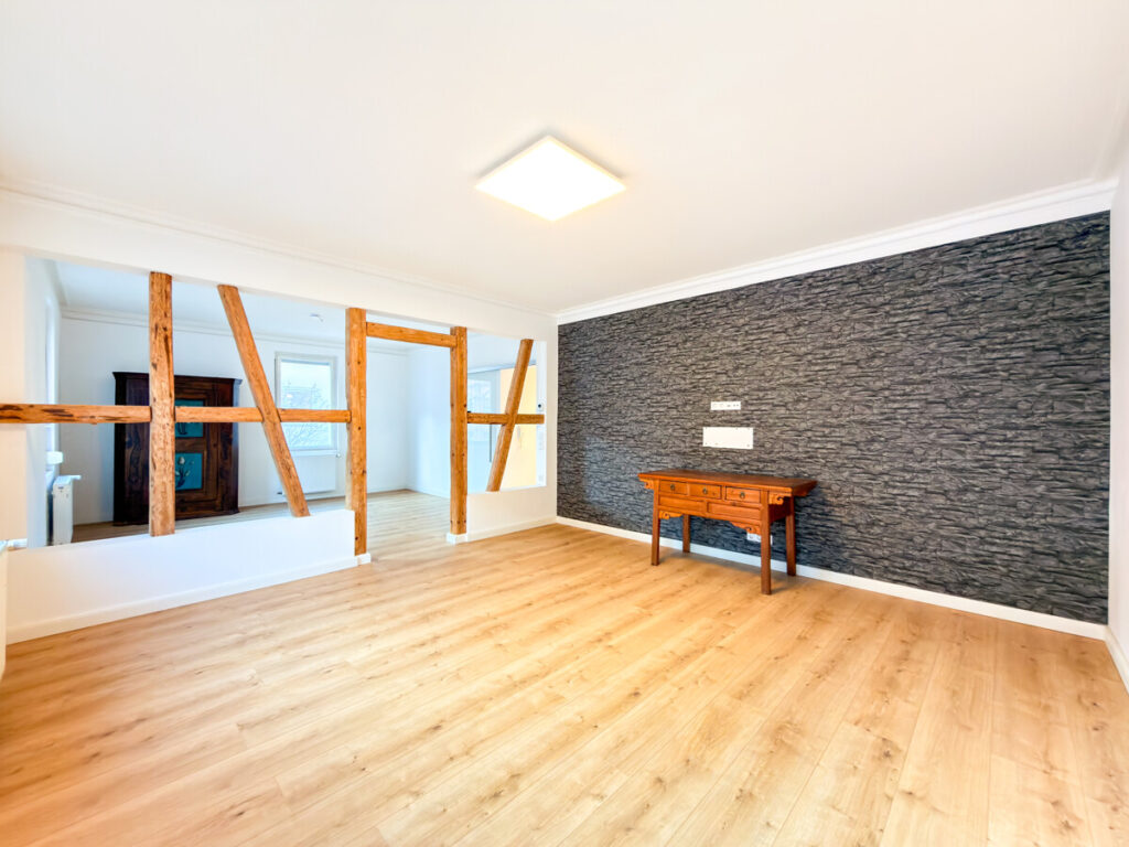 Der offene Wohn- und Essbereich bildet das Herzstück der Wohnung. Eine wunderschöne Abtrennung mit offen gelegten, restaurierten Holzbalken gliedert den Raum harmonisch und verleiht ihm Struktur und Tiefe. Im gesamten Wohnbereich sorgen Vinyl- und Dielenboden für eine moderne, zugleich wohnliche Atmosphäre.
