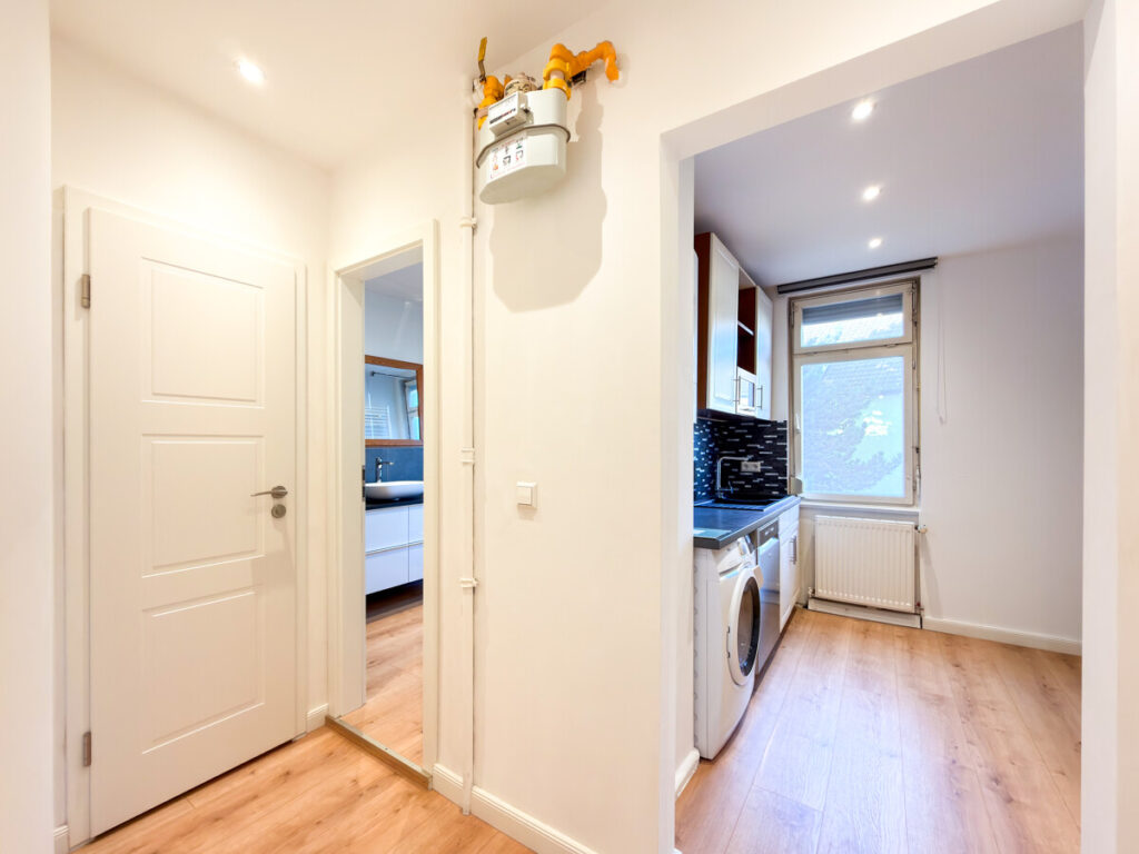 Die Einbauküche wird mitvermietet und ist inklusive Waschmaschine vollständig ausgestattet. Direkt angrenzend befindet sich ein Abstellraum, ideal nutzbar als Speisekammer oder zusätzlicher Stauraum.
