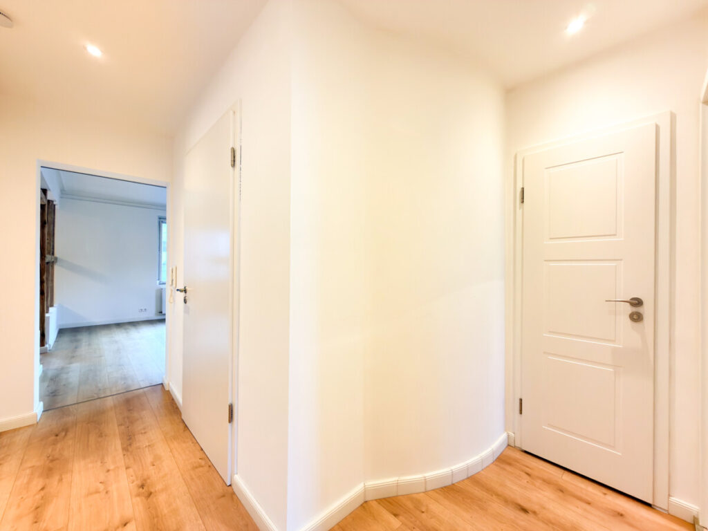 Über eine stilvolle Schiebetür gelangt man in den großzügigen Flurbereich, der mit einem Garderobenschrank viel Stauraum bietet.
