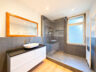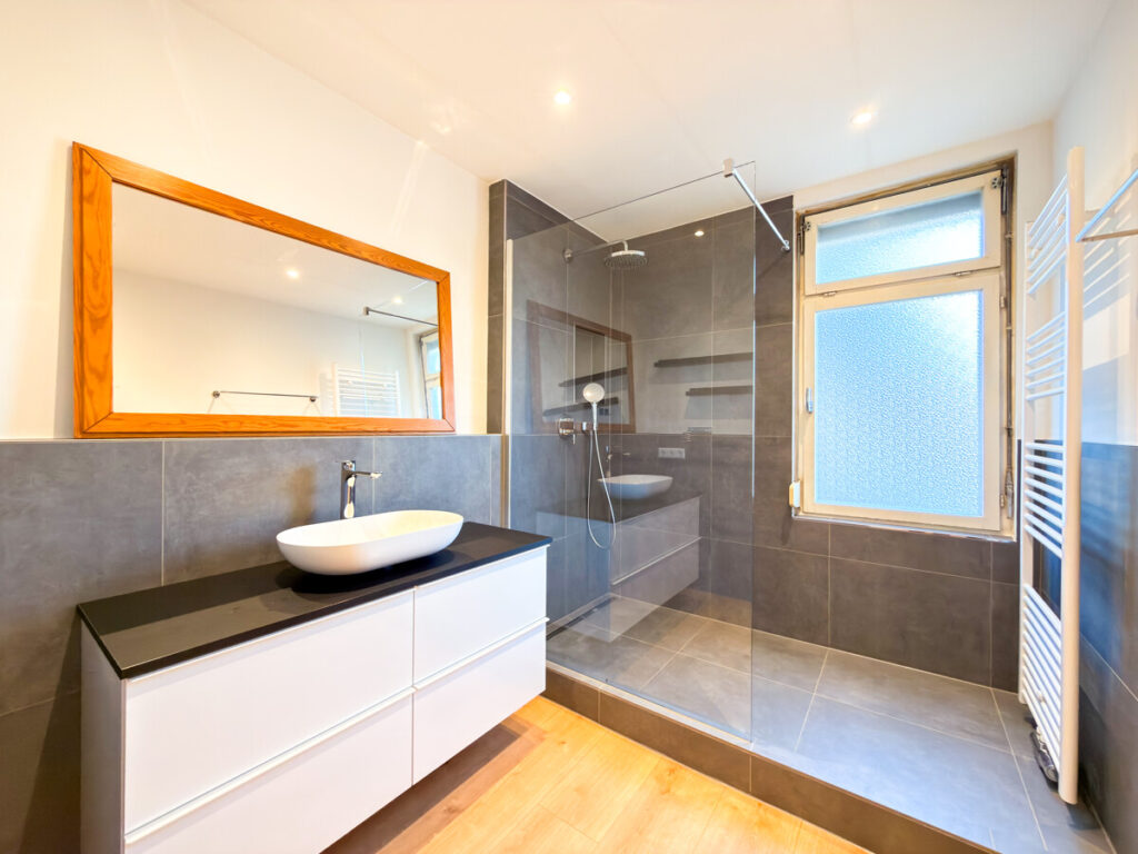 • Tageslichtbad, beide modern gestaltet mit Boden in Eicheoptik, großformatigen dunkelgrauen Wandfliesen und hochwertigen Badmöbeln (im Kaufpreis / Mietpreis enthalten).