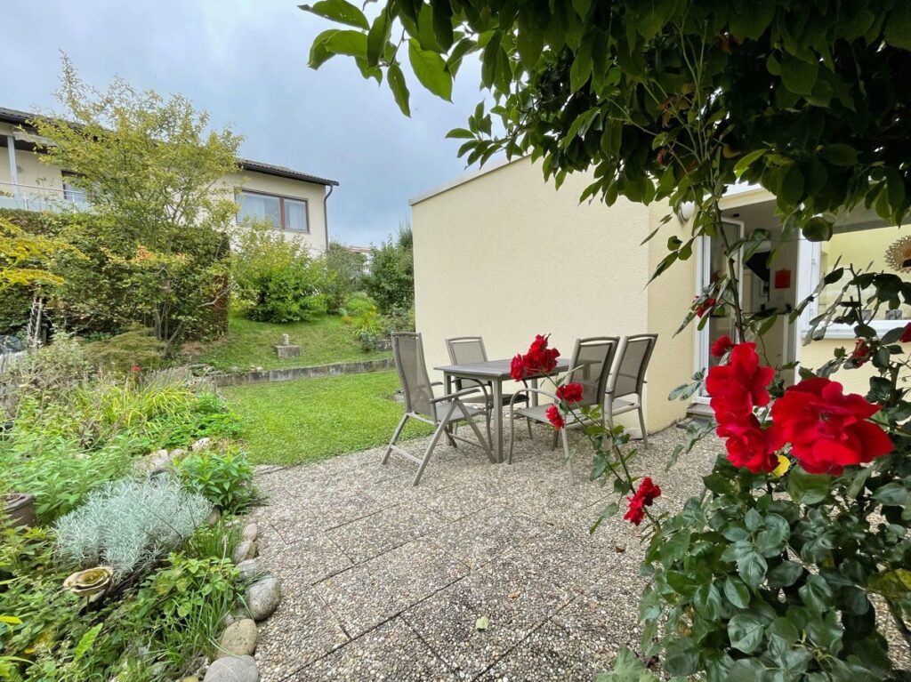Vom Essbereich aus gelangen Sie auf die sonnige Terrasse mit Garten und einem charmanten Gartenhaus – ein idealer Ort zum Entspannen oder für gesellige Stunden im Freien.