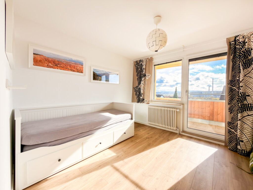 Im Obergeschoss erwarten Sie zwei weitere, lichtdurchflutete Zimmer – beide mit Zugang zum Balkon und traumhafter Aussicht. Das modern geflieste Tageslichtbad überzeugt mit einer begehbaren Dusche, einem stilvollen Waschtisch mit Unterschrank, Spiegelschrank sowie einem separaten WC das mit einer eingebauten Bidet-Funktion ausgestattet ist. Großzügige Einbauschränke im Flur sorgen für zusätzlichen Stauraum.