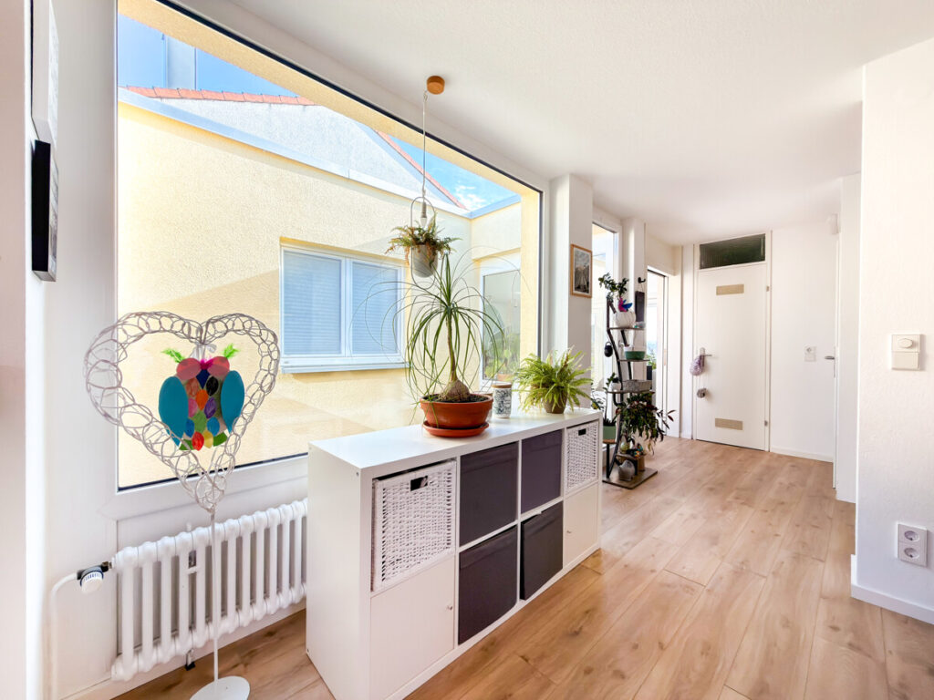 Schon beim Betreten werden Sie von einer freundlichen Diele empfangen, die den Blick in den liebevoll begrünten Innenhof freigibt. Der helle Essbereich grenzt direkt an die moderne Einbauküche, die bereits im Mietpreis enthalten ist – perfekt für gemeinsame Kochmomente.