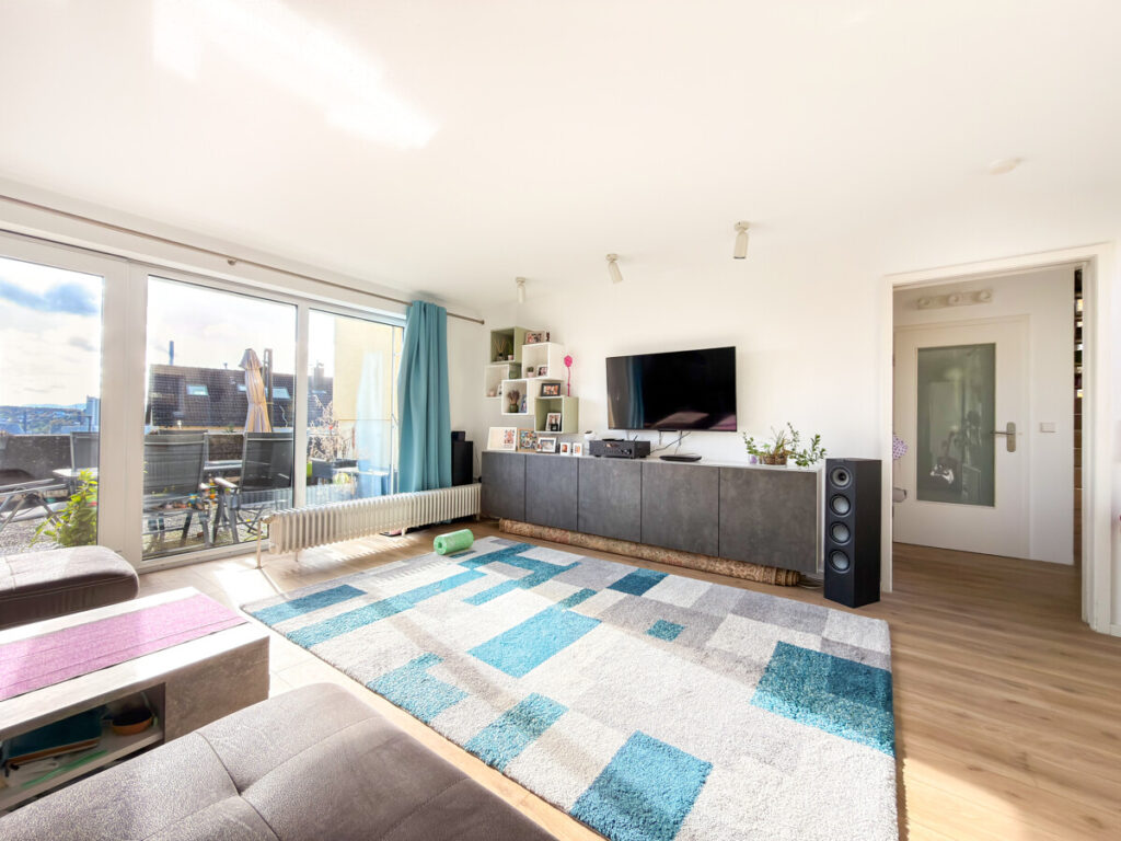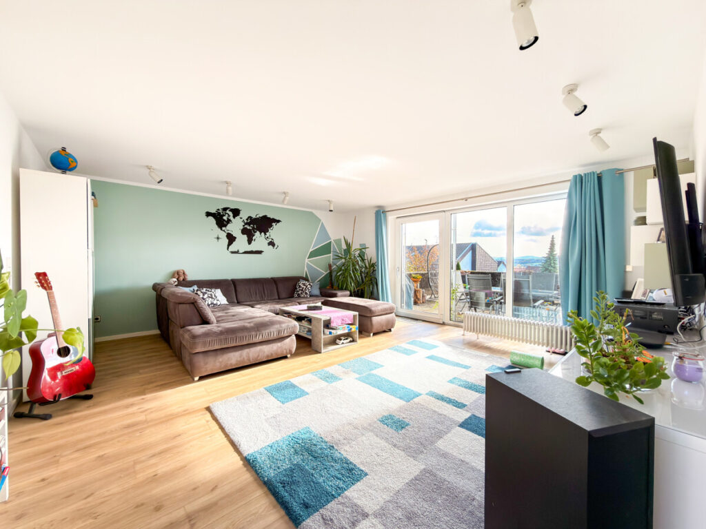 Das großzügige Wohnzimmer begeistert durch seine Helligkeit und den Zugang zur großen Aussichtsterrasse. Hier genießen Sie einen herrlichen Ausblick und können den Tag bei einem Glas Wein gemütlich ausklingen lassen.