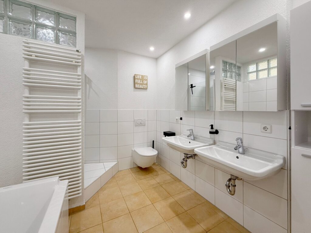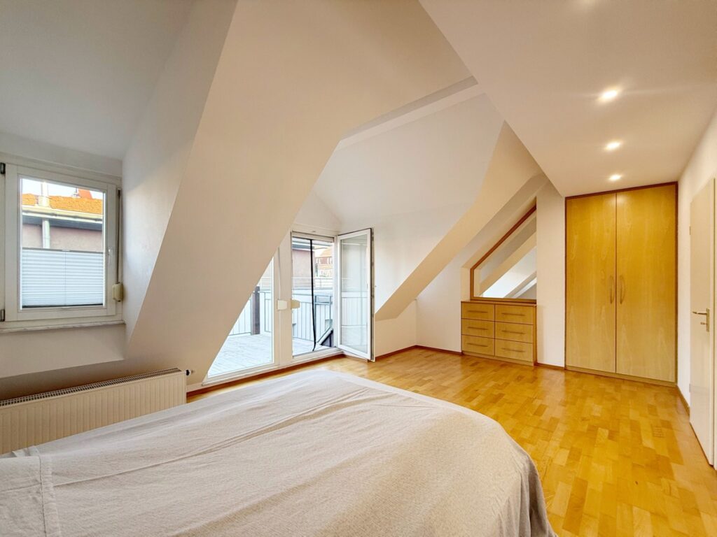Eine elegante Holztreppe führt Sie in das Dachgeschoss, wo zwei großzügige Zimmer sowie ein geschmackvolles Badezimmer auf Sie warten. Das Badezimmer überzeugt mit einer neuen Dusche, Badewanne, Handtuchheizkörper, zwei Waschtischen und einem WC. Das geräumige Schlafzimmer mit seinen Einbaumöbeln bietet Zugang zu einem weiteren Balkon, von dem aus Sie einen wunderschönen Ausblick genießen können. Das zweite Zimmer auf dieser Ebene eignet sich hervorragend als Kinder-, Gäste- oder Arbeitszimmer. Die hohen Räume verleihen den beiden Räumen einen ganz besonderen Flair.