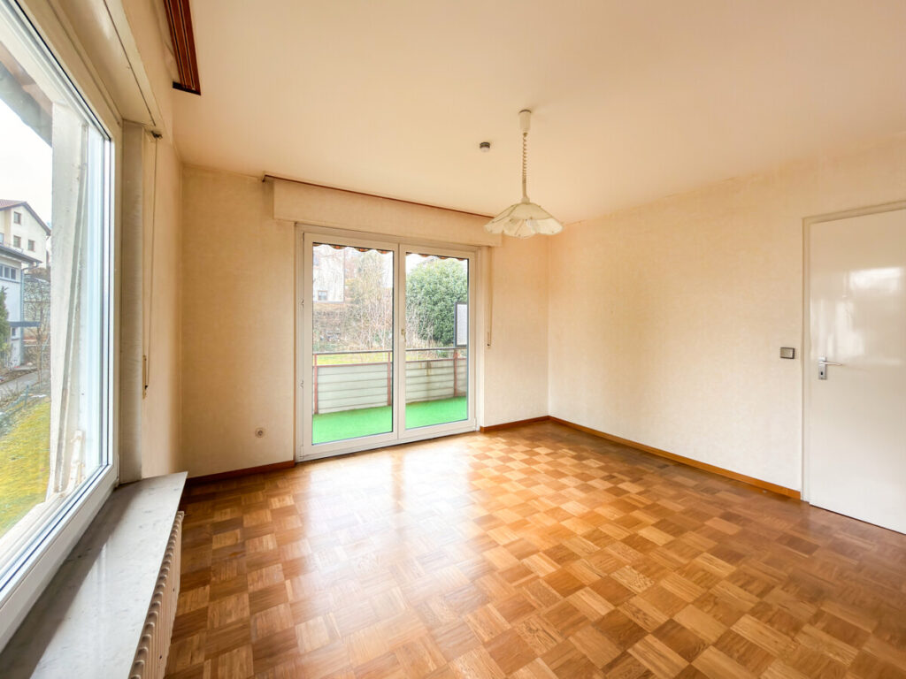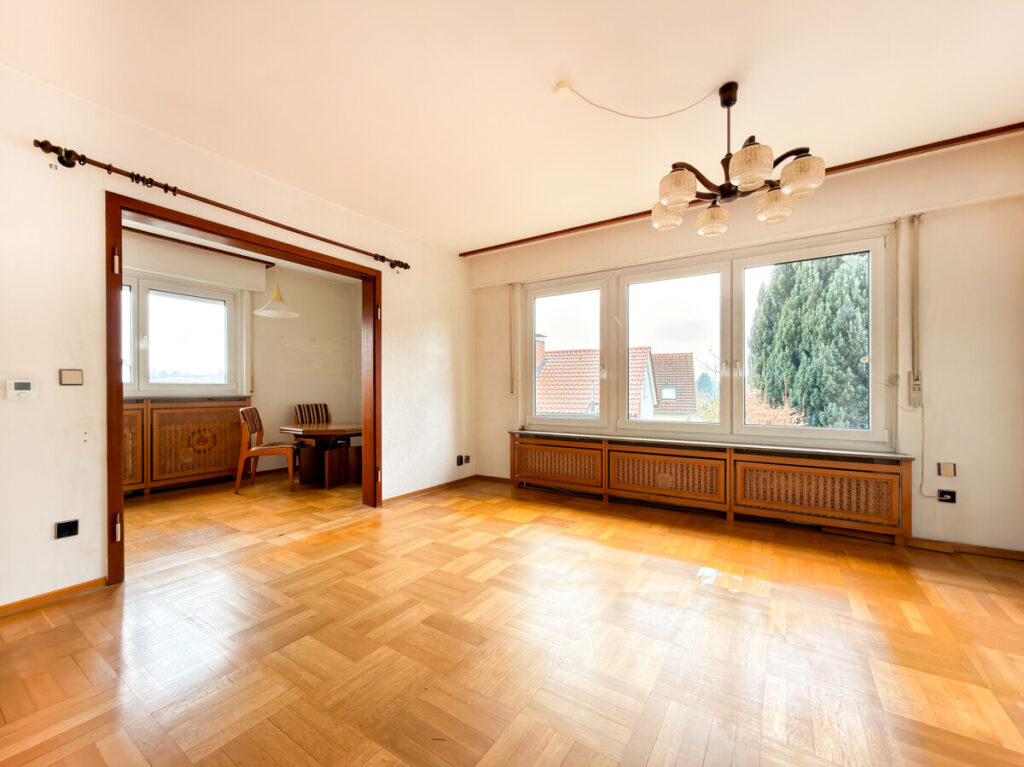 Obergeschoss: Die bezugsfreie Wohnung bietet einen großzügigen Wohn- und Essbereich mit großer Fensterfront und direktem Zugang zur angrenzenden Küche. Über den Flur gelangt man zu einem Schlafzimmer mit Balkonzugang und Blick in den Garten sowie zu einem Kinderzimmer mit ebenfalls eigenem Balkonzugang. Ein Tageslichtbad aus dem Baujahr mit Badewanne und Waschbecken sowie ein separates WC ergänzen die Wohnung.